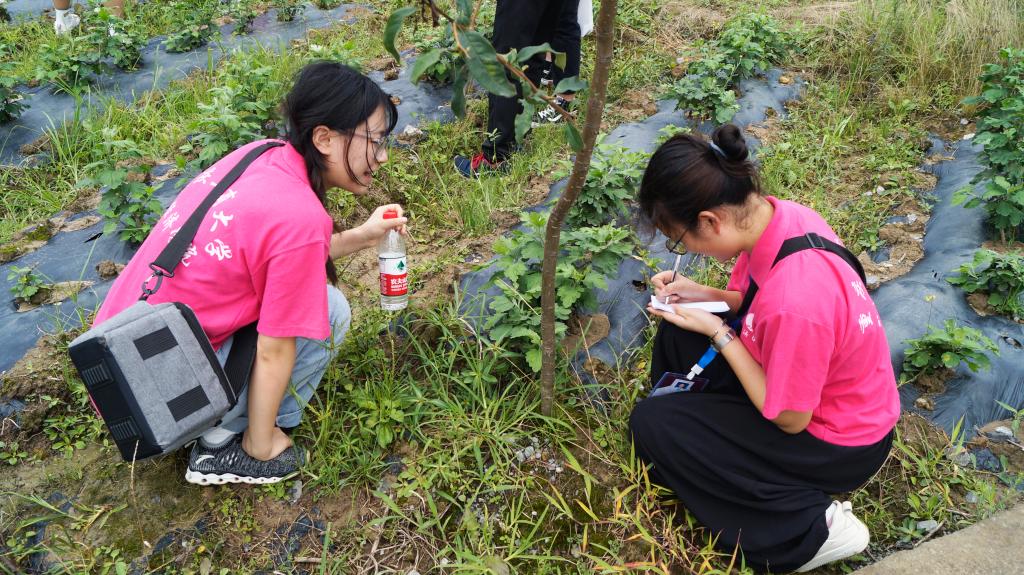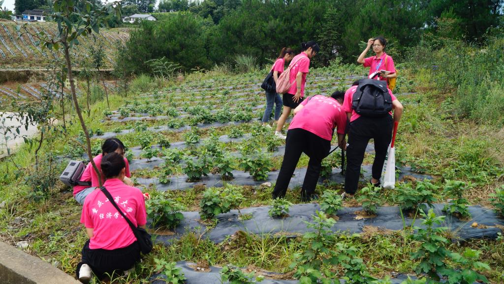在黎香湖镇政府农林服务中心主任刘君的带领下,实践团成员走进了中医药材种植基地。实践团成员在调研考察过程中了解到当地政府联合公司聘请专业地质勘查队对当地土质进行勘测,结合当地温度、降雨等自然条件,因地制宜,引进适合的品种种植。该中医药材种植基地采用“公司+基地+农户”的模式,规范化地种植、管理提高药材质量,提升种植效益,拓宽了药材销售渠道,并充分利用农村剩余劳动力在种植成熟期人工采摘,促进农民增收。在中医药材种植田间,成员们发现当地在种植技术上采用“覆膜技术种植+高低套种+喷灌”,节约用水、节省劳动力的同时也能够降低灌溉成本,并在一定程度上加强中药材的呼吸作用和光合作用、增加产量。基地将“观赏+食用+药用”充分结合,将中医药材基地建设成集现代生态观光、中药采摘观赏等为一体的现代新农村型的中药材种植模式。