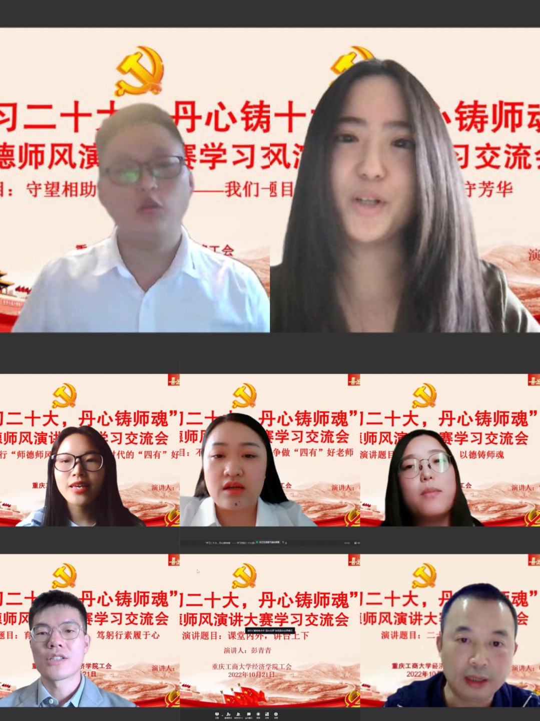 10月21日,在党的“二十大”召开之际,太阳成集团tyc122cc党委和工会举行了学习二十大报告暨师德师风演讲比赛,因疫情防控需要,本次学习和比赛活动采取了线上的方式,全院100余名教职工参加了在线活动。