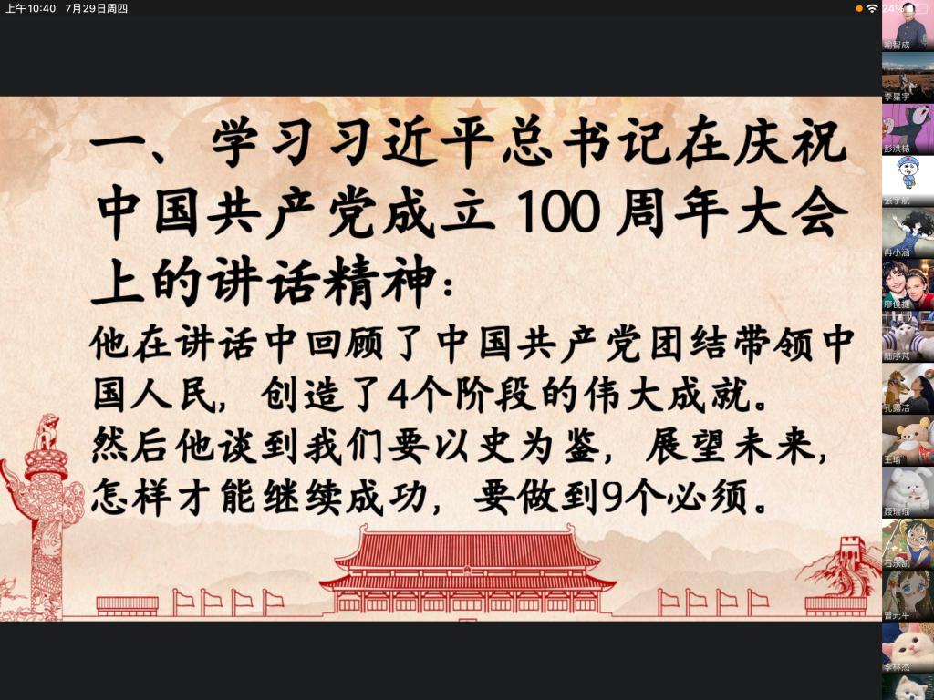会上,全体党员在喻智成老师的带领下,再次温习了习总书记在“七一”讲话的主要内容。在“七.一”讲话中,习总书记代表党和人民庄严宣告,经过全党全国各族人民持续奋斗,中国实现了第一个百年奋斗目标,在中华大地上全面建成了小康社会,历史性地解决了绝对贫困问题,正在意气风发向着全面建成社会主义现代化强国的第二个百年奋斗目标迈进。习总书记回顾了为了实现中华民族伟大复兴,中国共产党团结带领中国人民,创造了新民主主义革命、社会主义革命和建设、改革开放和社会主义现代化建设、新时代中国特色社会主义四个阶段的的伟大成就。以史为鉴、开创未来,在新的征程上,习总书记强调我们必须坚持中国共产党坚强领导、必须团结带领中国人民不断为美好生活而奋斗、必须继续推进马克思主义中国化、必须坚持和发展中国特色社会主义、必须加快国防和军队现代化、必须不断推动构建人类命运共同体、必须进行具有许多新的历史特点的伟大斗争、必须加强中华儿女大团结、必须不断推进党的建设新的伟大工程才能继续成功,从而在新的征程上更加坚定、更加自觉地牢记初心使命、开创美好未来。在“七.一”讲话中,习总书记表明了我们在香港、澳门、台湾上问题上的态度,一方面我们要维护国家主权、安全、发展利益,维护特别行政区社会大局稳定,保持香港、澳门长期繁荣稳定。另一方面,任何人都不要低估中国人民捍卫国家主权和领土完整的坚强决心、坚定意志、强大能力!同时我们也绝不接受“教师爷”般颐指气使的说教!在“七.一”讲话中,习总书记寄语青年,新时代的中国青年要以实现中华民族伟大复兴为己任,增强做中国人的志气、骨气、底气,不负时代,不负韶华,不负党和人民的殷切期望!最后,习总书记号召全体中国共产党员牢记初心使命,坚定理想信念,践行党的宗旨,永远保持同人民群众的血肉联系,始终同人民想在一起、干在一起,风雨同舟、同甘共苦,继续为实现人民对美好生活的向往不懈努力,努力为党和人民争取更大光荣!