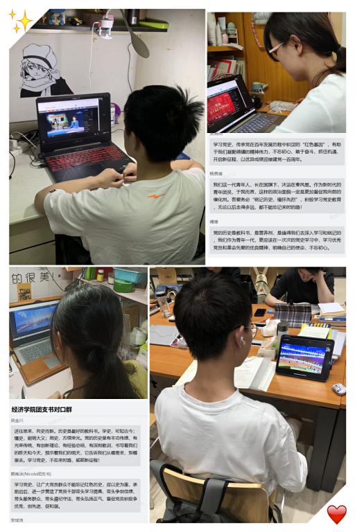 观看之后,同学们纷纷发表感想, 19级国贸一班的团支书李冰同学认为,学史可以明理,学史可以增信,学史可以崇德。今年我党迎来了建党一百周年华诞,真是普天同庆,通过观看党史学习大会,学习了党史知识,回顾我党的艰苦奋斗之旅,受益良多。2019级研究生团支书易桂林表示,江河万里,七月的丰碑耸立不朽,神州大地,一百年的党史辉煌灿烂。新时代青年应自觉回顾党的历史,感受党的精神,方能不忘初心,继续前行。18经济学一班的张津谈到,学院分团委大力推进基层团组织建设,让广大团员青年们更加明确学习党史的重要性,提高思想觉悟的纯洁性。作为大学生的我们,要在学习党史、端正思想的同时,感悟这些优秀党员同志的精神,向他们学习,向他们致敬!