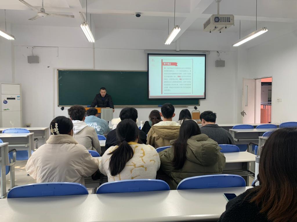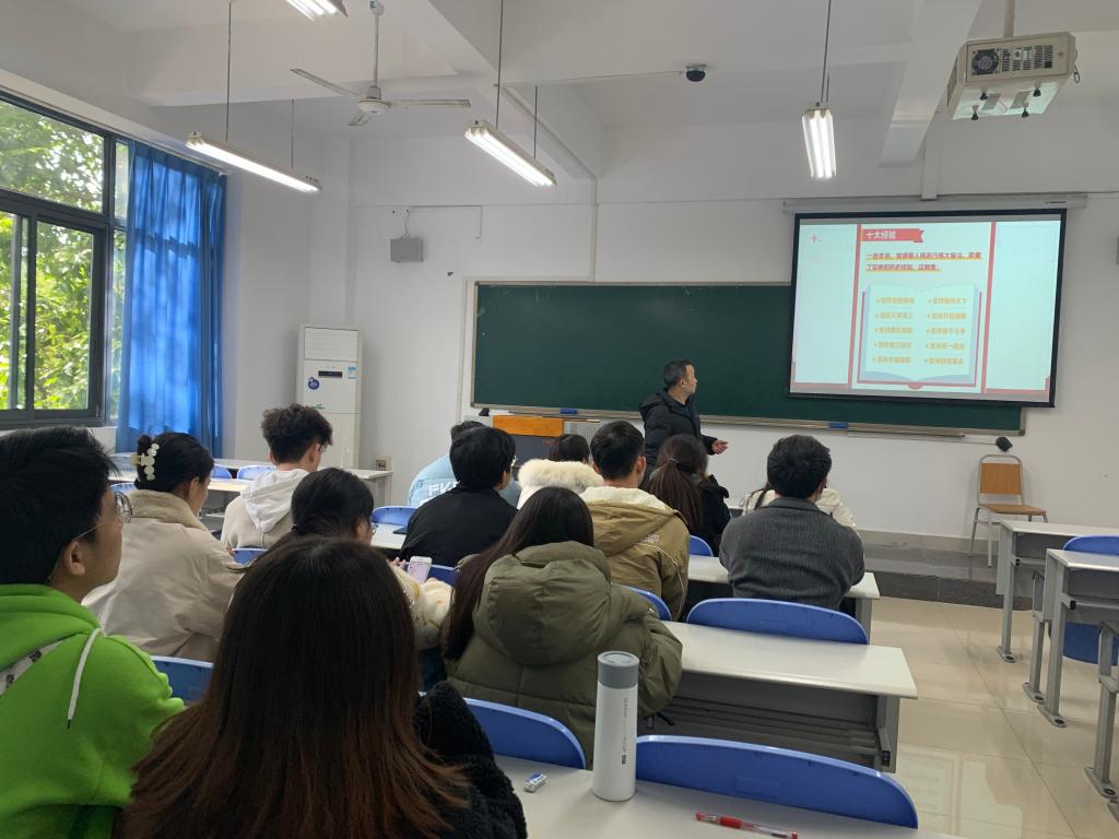 在会上,参会全体党员在喻智成的带领下,先通过一段视频了解了中国共产党历届六中全会。然后通过PPT从“一二三四五十”六个方面重点学习了十九届六中公报。他指出,学习十九届六中全会,必须牢记“一二三四五十”:一个根本问题,一个号召,两个确立,两个始终,三次飞跃,三个需要,四个必须,四次伟大飞跃,五个历史意义,十大经验。他重点解读了十大经验里面的必须坚持人民至上的这个经验,他说,回顾党的百年征程,党无时无刻不把人民放在第一位。从三大纪律八项注意到为人民服务,从密切党同群众的血肉联系到发展为了人民,发展依靠人民,无不体现党的性质和宗旨。作为一名学生党员,必须要有人民至上的理念,服务同学就是服务人民,无论是现在的服务同学还是今后的服务人民,都要坚定理想信念,牢记初心和使命,担当责任,充分发挥党员的先锋模范作用,彰显党员的优秀品格。