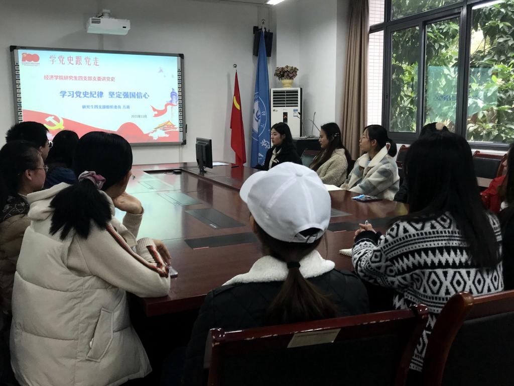 其后,研究生四支部组织委员方涛对党史中的纪律史做出阐述,她指出纪律严明是我们党信念和宗旨的集中体现,也是我们党的光辉传统和独特优势。方涛详细地介绍了中国共产党的纪律要求,列举了毛泽东、周恩来、刘少奇等优秀党员严格践行党的纪律的事迹,以生动简明的方式向同学们强调纪律的重要性。