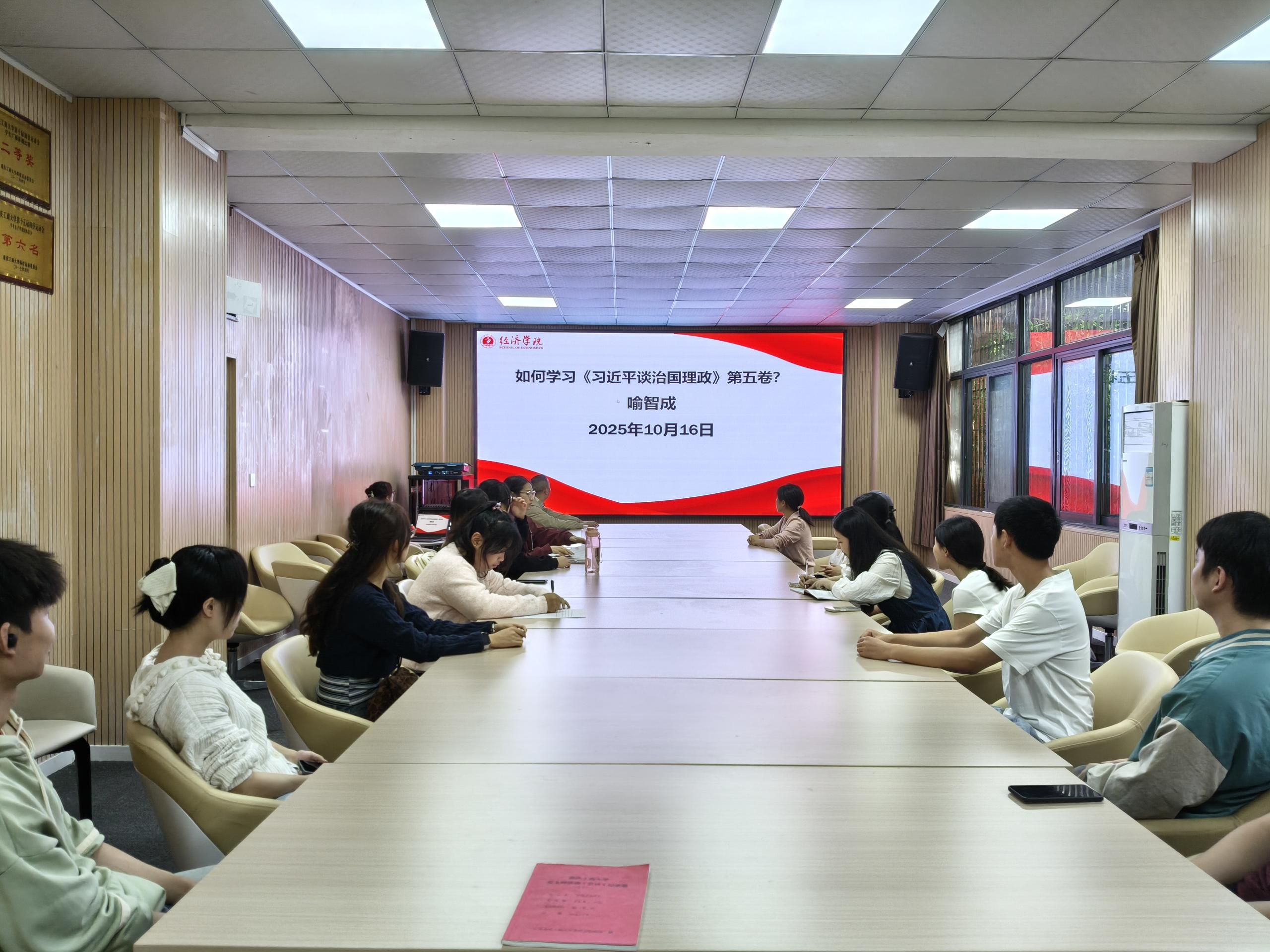 大会开始,支部书记喻智成同志首先领学《习近平谈治国理政》第五卷,他介绍了第五卷总体概况,该书收录了习近平总书记2022年5月27日至2024年12月20日期间91篇重要文献,涵盖报告、讲话等多种形式,分为18个专题。他领学内容围绕三个方面展开:一是明确重点内容,指出该书记录了党中央统筹“两个大局”、推动高质量发展的实践,展现了马克思主义中国化时代化最新成果,是反映习近平新时代中国特色社会主义思想的权威著作;二是解读整体框架,将开篇报告与18个专题划分为总论、实践路径、根本保障三部分;三是向支部党员提出学习要求,传达中央通知精神,强调需将其与前四卷作为整体学习,引导大家读原著悟原理,坚持理论联系实际,实现学思用贯通、知信行统一,凝聚起以中国式现代化全面推进强国建设、民族复兴伟业的磅礴力量。