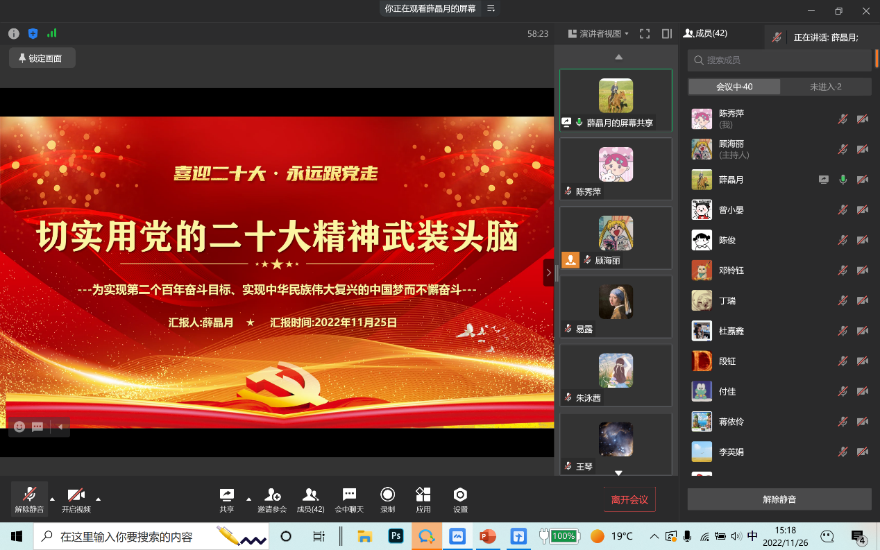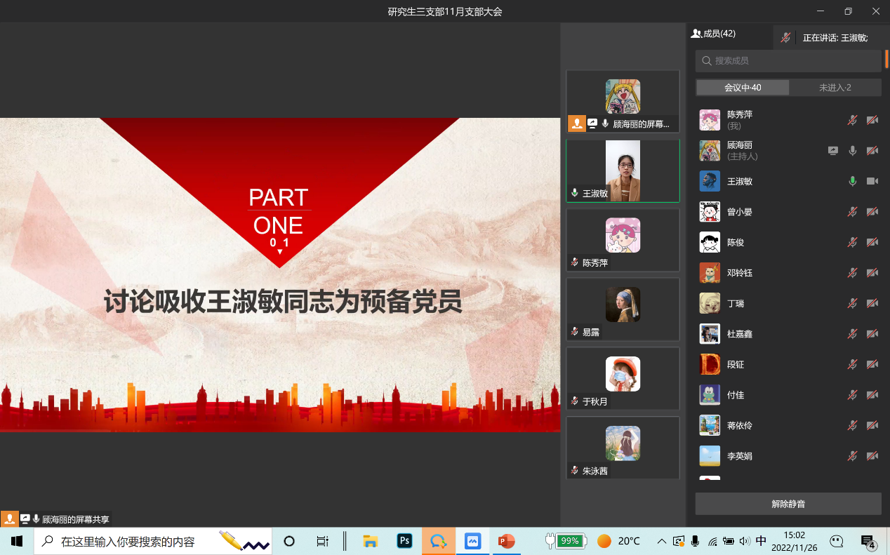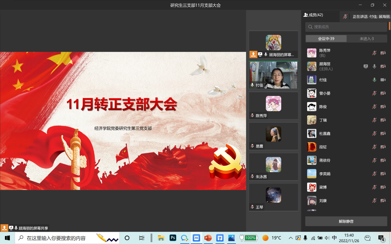 2022年11月26日,太阳成集团tyc122cc研究生第三党支部通过企业微信线上会议召开了11月支部大会,会议内容包括支部书记讲党课事宜、预备党员转正以及讨论接收预备党员事宜。本次会议由支部书记薛晶月主持,研究生三支部全体党员参加。