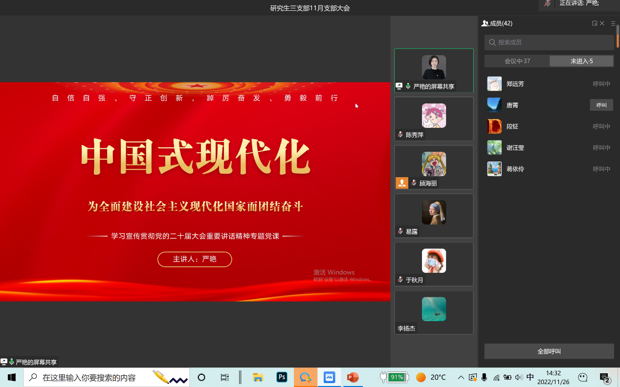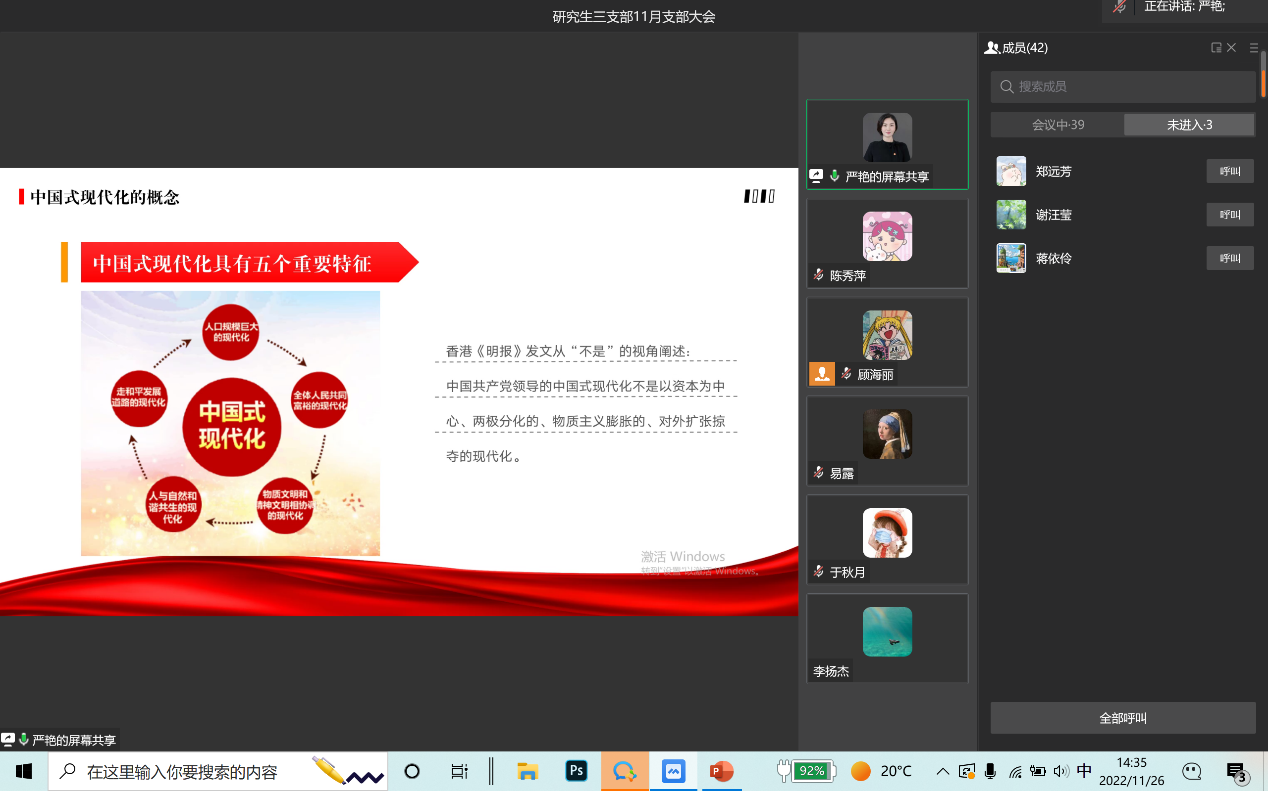 2022年11月26日,太阳成集团tyc122cc研究生第三党支部通过企业微信线上会议召开了11月支部大会,会议主要内容是党委委员严艳讲党课。本次会议由支部书记薛晶月主持,研究生三支部全体党员参加。
