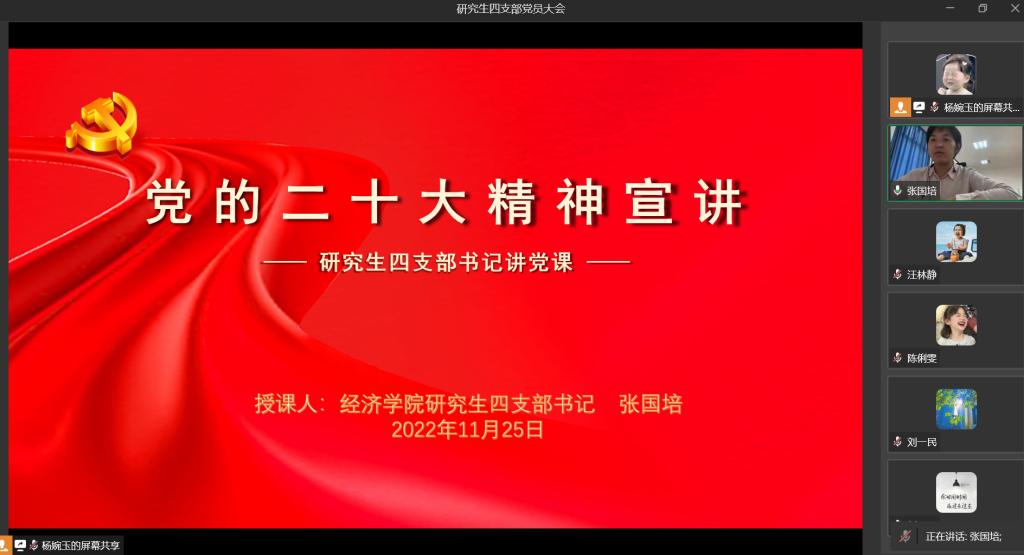 11月25日下午2点,太阳成集团tyc122cc研究生四支部通过企业微信开展了支部书记讲党课活动,研究生四支部书记张国培带领支部党员同志学习党的二十大精神。本次讲党课活动由研究生四支部宣传委员杨婉玉主持,研究生四支部全体党员参加学习。