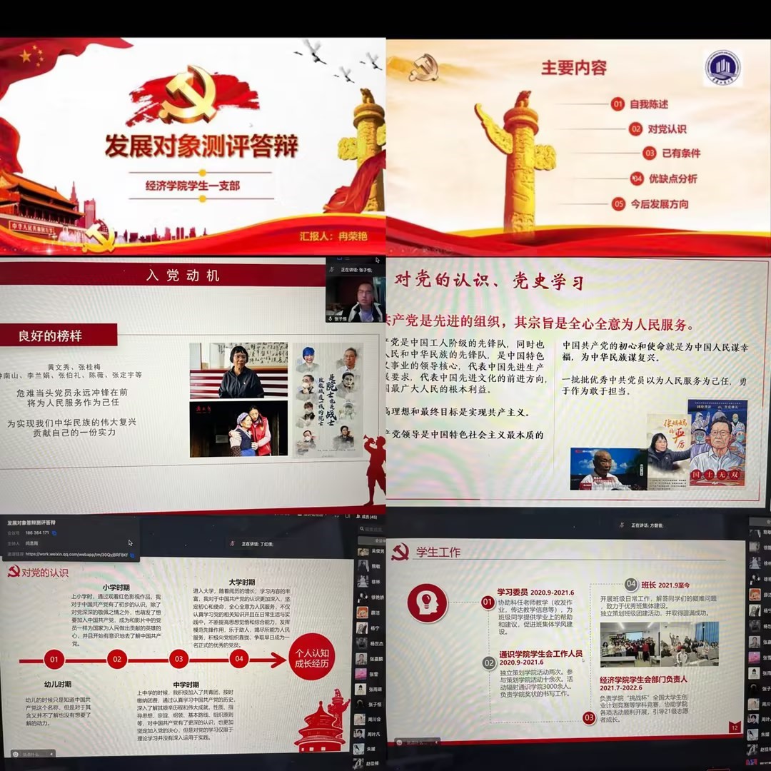 为深入学习习近平新时代中国特色社会主义思想,永葆党组织的纯洁性和先进性,加强学生党员的培养、教育和考察,4月24日20点,学生第一党支部通过线上企业微信形式召开党员发展对象民主测评会。本次大会由支部书记陈璐主持,支部全体党员、参加答辩的发展对象参加。