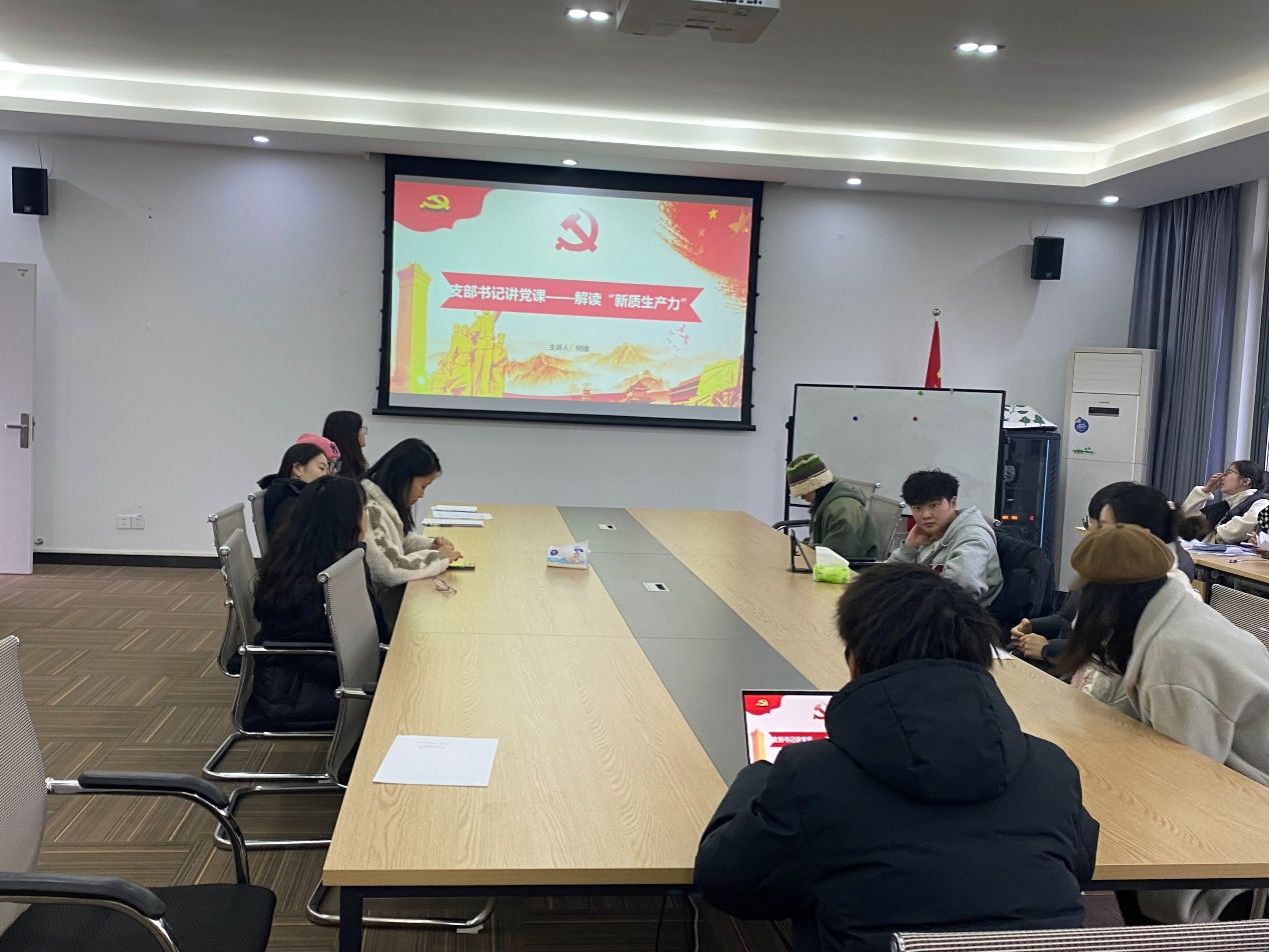 12月28日,太阳成集团tyc122cc研究生第四党支部开展学习贯彻习近平新时代中国特色社会主义思想主题教育活动,研究生四支部统战委员何建为支部党员讲授题为《解读“新质生产力”》的党课。
