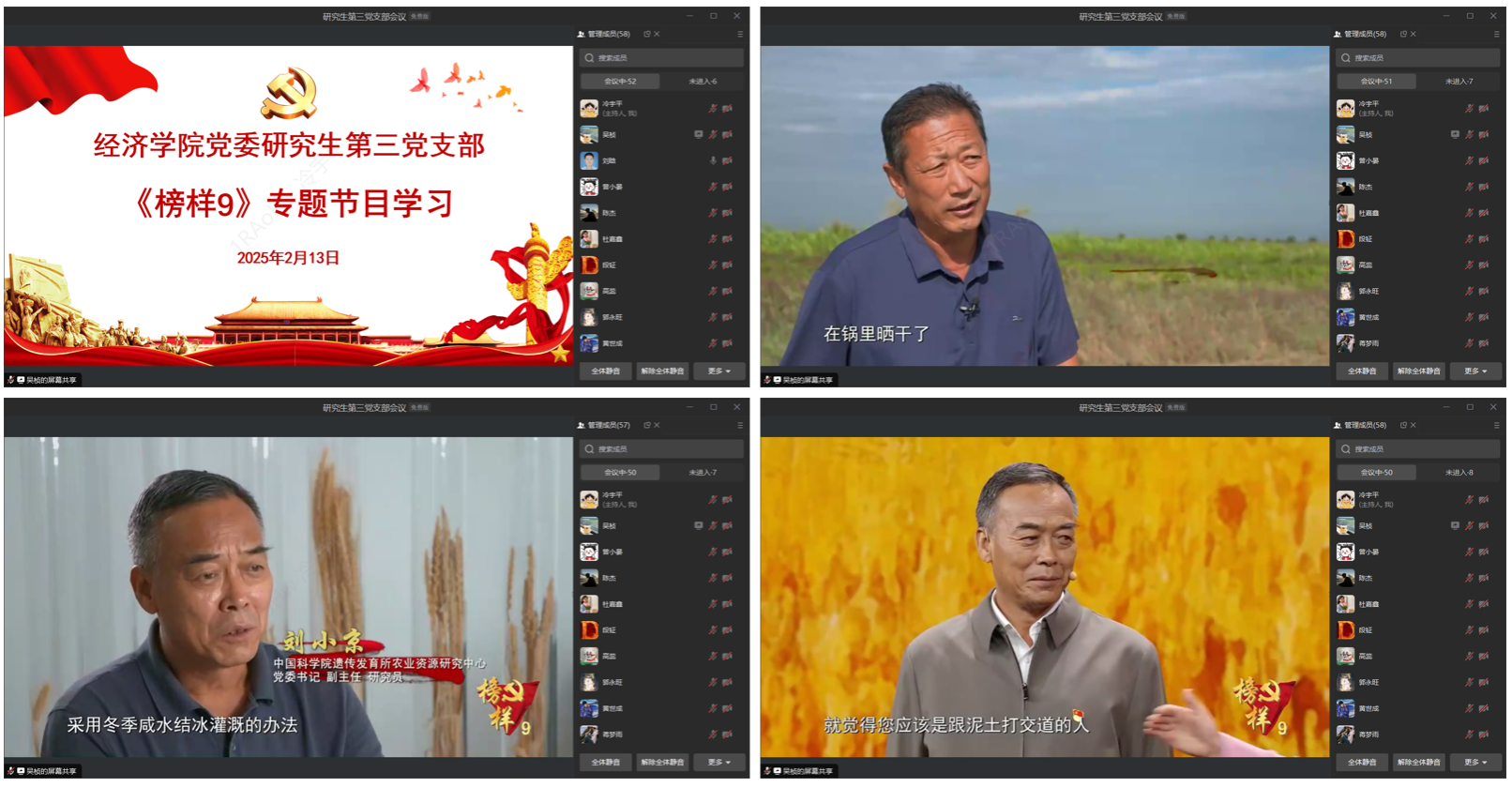 支部党员集体观看《榜样9》专题节目中《刘小京:我要把论文写在大地上 在盐碱地上种出希望》的视频,通过视频内容,支部党员了解到,盐碱地是世界上比较难治理的土地之一,刘小京自1991年研究生毕业后便投入到盐碱地改良的工作当中,在与盐碱地打交道的33年中,刘小京发明了用秸秆深埋到土壤耕作层20公分以下来阻止盐分上升的技术和咸水结冰灌溉技术,寒来暑往,刘小京团队成功使得土壤含盐量从千分之十下降到千分之三,荒地改造成了良田。通过对刘小京盐碱地改良榜样事迹的视频学习,支部同志深有感触,作为从事科研工作的研究生,不光要会写论文,更要知道学以致用,在论文研究的基础上能够实现研究成果的转化才是最有价值的。