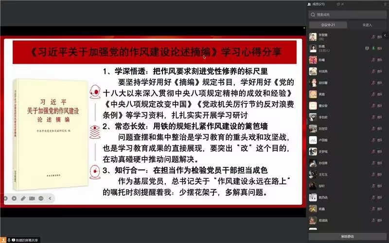 会议的最后一项议程,陈璐同志分享了《习近平关于加强党的作风建设论述摘编》学习心得。陈璐同志指出,学习《习近平关于加强党的作风建设论述摘编》,要做到学深悟透,把作风要求刻进党性修养的标尺里,通过深入学习《摘编》规定书目以及相关学习资料,扎实开展学习研讨,不断提升党员们的党性修养;要实现常态长效,用铁的规矩扎紧作风建设的篱笆墙,在学习教育中突出“改”的目的,动真碰硬解决问题,将作风建设贯穿始终;要做到知行合一,在担当作为中检验党员干部的担当成色,要牢记“作风建设永远在路上”,少摆花架子,多解真问题,切实为群众办实事、解难题。
