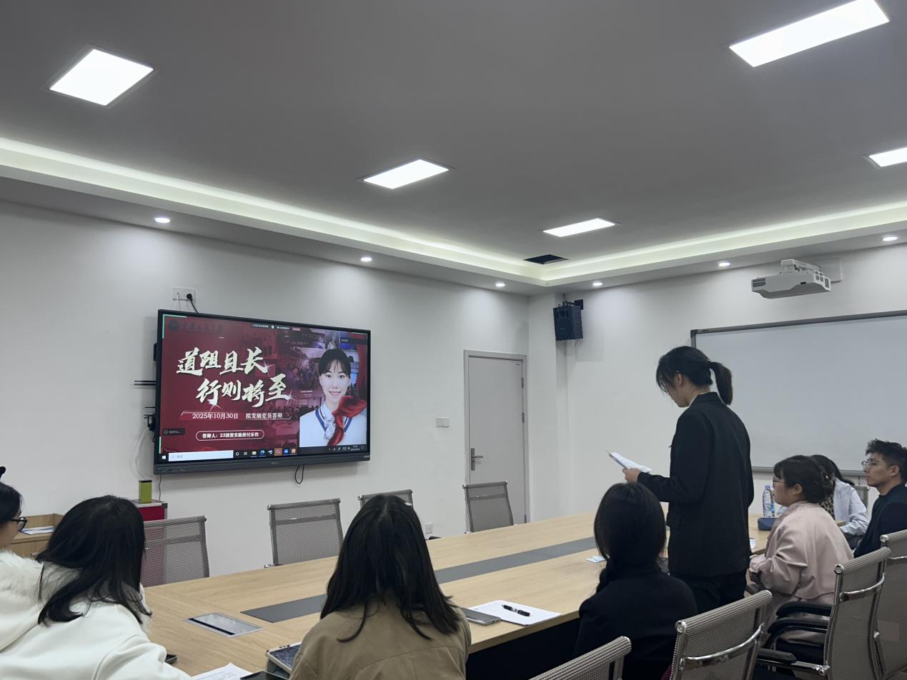 会议第二议程为拟发展党员答辩,舒雨阳、李星月、付乐怡等7 名发展对象依次登台,从个人思想、专业学习、社会实践情况入手,详细介绍了成长经历,深情讲述入党初心,表达对加入中国共产党的坚定追求和为党的事业奋斗终身的决心。在理论知识问答环节,答辩对象围绕党的基本理论、方针政策等内容从容应答,充分展现了扎实的理论功底和端正的入党态度。全体党员认真聆听,对答辩对象的表现进行综合评议,为进一步考察发展对象的政治素养和思想觉悟提供了重要依据,切实把好党员发展 “入口关”。