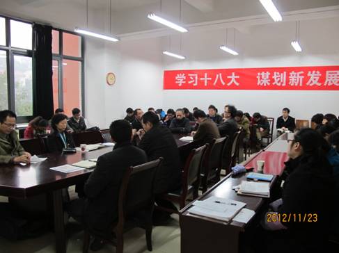 然后,结合学院实际和本职工作,学院各位老师积极踊跃的畅谈自己对十八的感想与体会:张宝均教授希望能解决两个方面的问题:一是国强民富的问题,提到应该减少外汇储备,用来抓就业和民生,二是“反腐败”的问题,希望政府能出台具体措施来解决,如官员财产公示等;刘成杰教授认为十八大为我们教育工作者和科研工作者指明了方向;韩渝辉教授评价十八大报告实事求是、客观冷静,结合专业倡导将西方经济的优秀成果与我国实际相结合;熊维勤博士结合自己的专业对“科技体制改革”进行深入分析,认为把“科技创新”上升到国家战略的地位具有重大的意义;谢新教授认为从十八大报告可以看出党中央居安思危,将各项问题看得很清楚,“实现好、维护好人们的利益为落脚点”的指导思想让人心里踏实,国家看重经济发展,对经济学学者来说很是振奋,也感觉责任重大;沈红兵博士认为十八大的亮点在于将“科学发展观”写入党章,提出要“转变经济发展方式”,大力推动电子商务进一步发展;陈淑祥教授十分关注十八大中提出的“全面建成小康社会”,认为党和政府应该拟出具体“小康”指标,比如提高高校教师收入水平等。郝颖老师比较关注教育公平问题,就助学金相关问题,认为为了彰显公平,应该减少助学金名额,用于加大学生奖学金金额,这样更能促进学风建设;姜鑫副院长认为高校教师应该吃透十八大精神,积极进行相关科研课题和项目的申报和专研。陈新力院长认为十八大主要提到两个方面的问题:一是思想问题,要坚定不移地走中国特色社会主义道路,二是价值问题,结合我校马上要搞的绩效工资,希望收入水平能和学校的发展程度一致,学院分配既要体现“公平”,又要衡量个人贡献,实现有效公平。