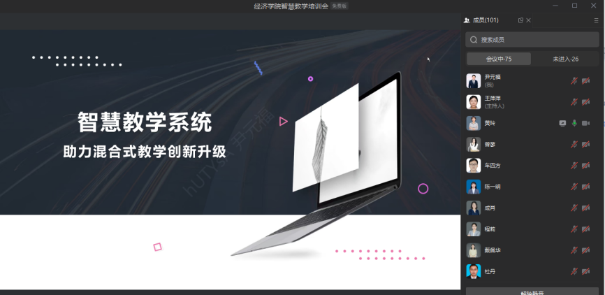 助力混合式教学创新升级》的主题培训。她从创建课程、资源添加、学生管理以及教师督学等方面对智慧教学系统进行深入浅出地讲解。参会老师就智慧教学系统的应用展开探讨,对教学技术、教学手段以及课堂内容衔接进行细致地打磨。
