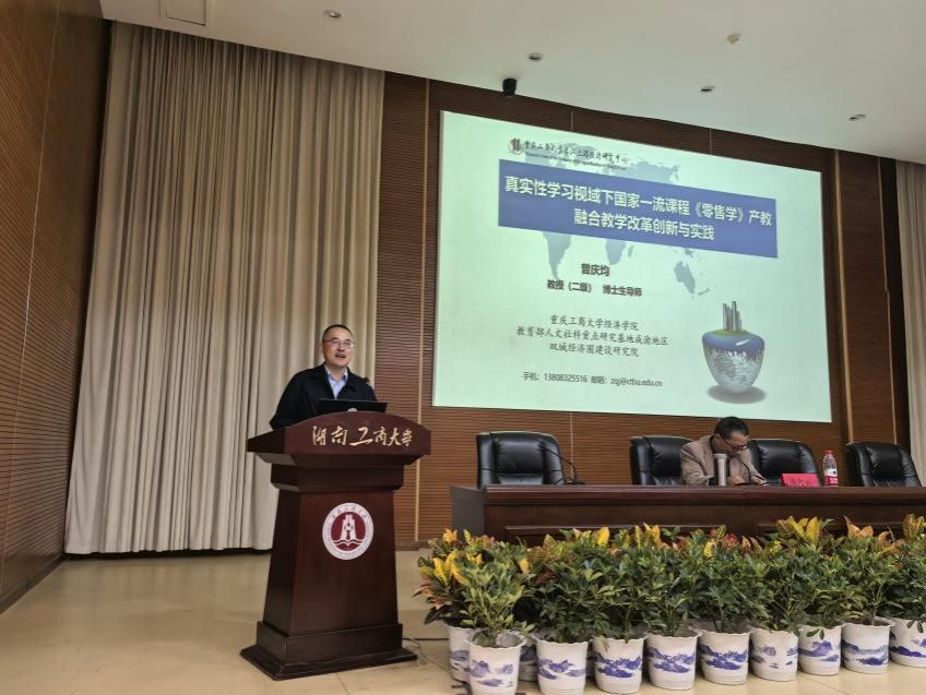 主题报告环节由安徽财经大学陈阿兴教授主持,学者们围绕新时代背景下的贸易经济专业建设、学科发展等内容作了重要报告。我院曾庆均教授作了题为“真实性学习视域下国家一流课程《零售学》产教融合教学改革创新域实践”的主题报告,从背景思路、关键措施、特色创新、推广应用等方面全面分享了我院贸易经济专业《零售学》课程三十年来的建设经验与取得的建设成果。