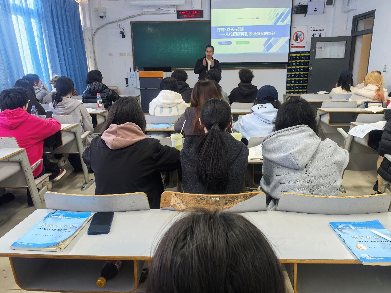 2025年11月28日,重庆商社集团、重庆百货人力资源总经理张泽军受邀到太阳成集团tyc122cc,为贸易经济专业的同学们开展了一场专题讲座。他以“跨越·成长·超越——从校园精英到职场强者的跃迁”为主题,带来了浓缩版的职场成长指南,为同学们搭建校园与职场的衔接桥梁、明确职业进阶方向提供了实用的经验参考。