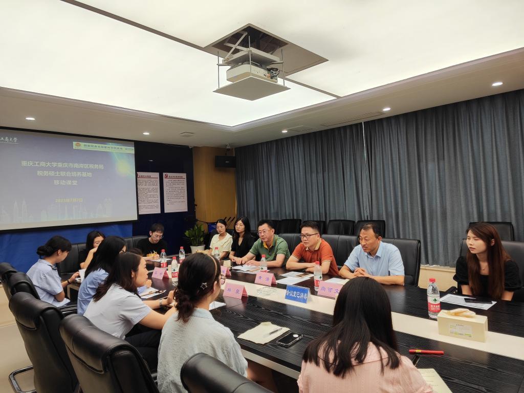 2023年7月7日,“122cc太阳集成游戏-南岸区税务局”市级研究生实践基地移动课堂在南岸区税务局举行。“122cc太阳集成游戏-南岸区税务局”市级研究生实践基地负责人、教务处副处长黄潇教授,太阳成集团tyc122cc尚可文教授以及12名税务专硕研究生;重庆市南岸区税务局纳税服务科科长林泉、税收风险控制科科长吴月、所得税科科长吴婷、第一税务所所长夏令、房地产税征收所所长谢新民,重庆市南岸区税务学会副会长肖智斌,出席此次活动。