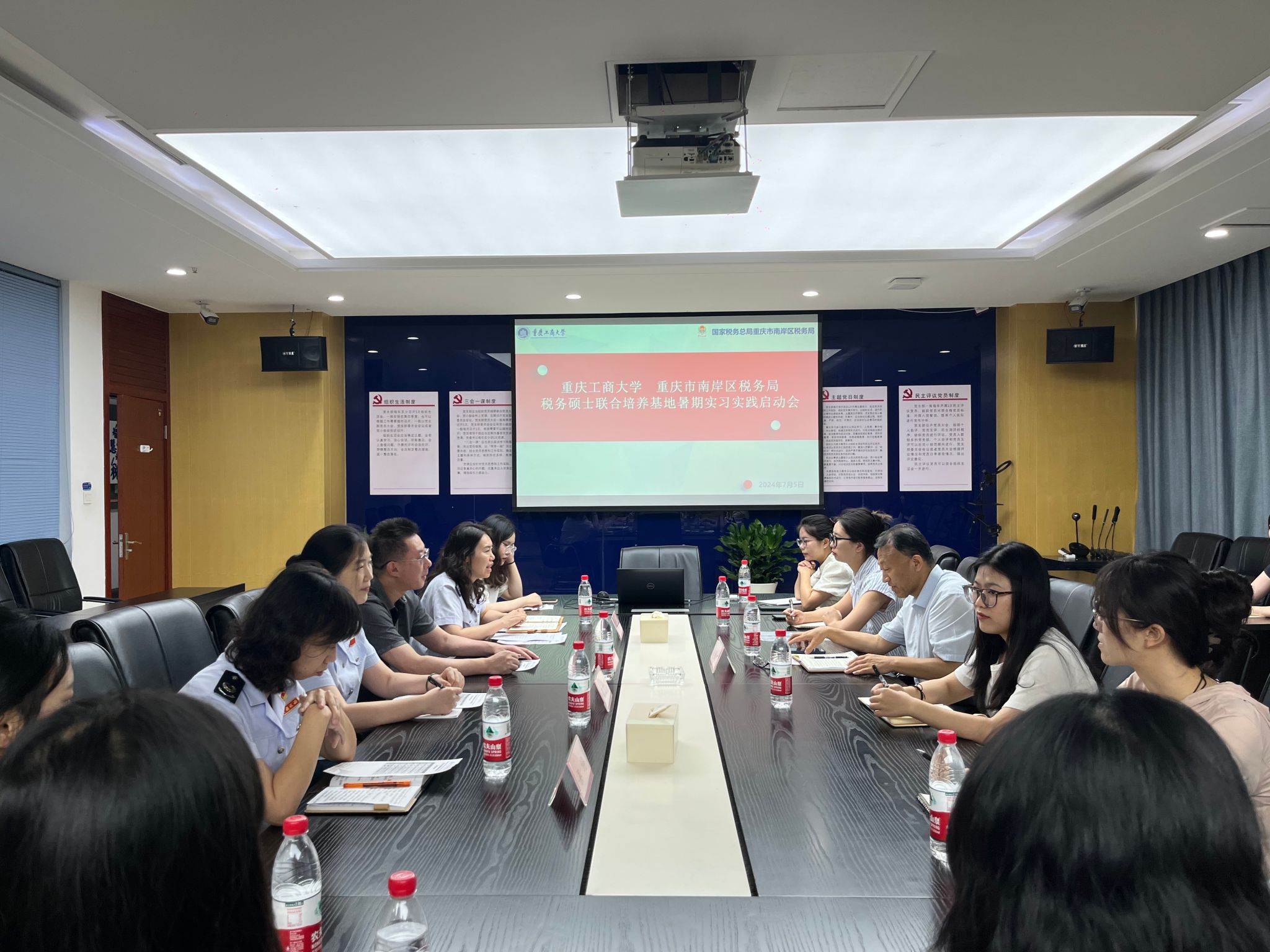 为了强化税务硕士研究生专业实践能力的培养,2024年7月5日下午,“122cc太阳集成游戏-重庆市南岸区税务局”市级税务硕士研究生联合培养基地暑期实习实践启动会在南岸区税务局第一税务所召开。重庆市南岸区税务局纳税服务科科长林泉、第一税务所副所长范丁瑕、铜元局税务所副所长吴婷、南岸区税务学会副会长兼秘书长肖智斌,122cc太阳集成游戏太阳成集团tyc122cc教授尚可文以及参加实习实践活动的12位税务专硕同学参加了动员会。