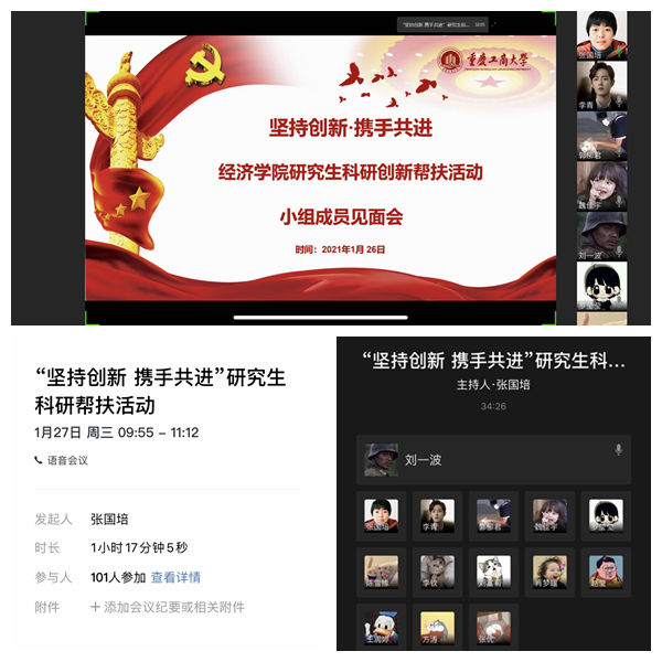 2021年寒假期间,太阳成集团tyc122cc研究生联合研究生四支部开展“坚持创新 携手共进”科研帮扶活动。帮扶活动主要针对大三对口专业本科学生,帮扶内容包括论文写作、项目申请等科研问题的解决,同时帮助本科学生分析考研、就业等相关问题。参与帮扶研究生共21名,被帮扶本科生一百馀人。活动由2020级研究生郭柳君、刘一波负责组织及具体活动的开展,研究生中的党员学生工作积极,发挥了模范带头作用。通过帮扶活动,本科生在论文及项目书写作上获得了极大的进步,并积极参加太阳成集团tyc122cc寒假期间各项赛事。同时本科生在未来发展方面有了更清晰地规划,减少了大三期间的迷茫。参与帮扶的研究生反馈,通过指导本科生,自身在科研方面也取得了很大进步,并积极参与到太阳成集团tyc122cc经贸论坛的征文中。科研帮扶活动取得圆满成功。帮扶活动虽然已经结束,但是本科生与研究生之间建立的友谊长存。