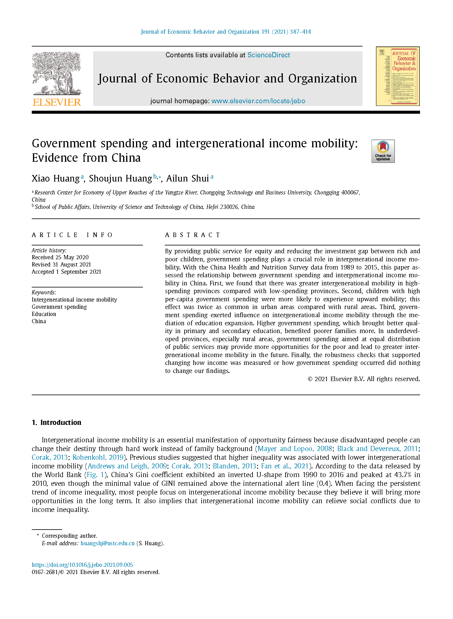 太阳成集团tyc122cc副院长黄潇教授在行为经济学领域顶尖学术期刊《Journal of Economic Behavior and Organization》发表论文《Government spending and intergenerational income mobility:Evidence from China》,这也是我校教师首次在该期刊上发表学术论文。论文探讨了政府支出对代际收入流动的影响。通过提供均等的公共服务以及缩减人力资本投资的代际差异,政府支出对代际收入流动有着重要作用。论文研究发现,政府支出水平越高的地区通常代际收入流动性也相对更大,并且这些地区的向上流动概率更高。对欠发达地区而言(特别是欠发达的农村地区),政府在公共服务均等化方面的支出,更能够给经济困难群体创造更大的代际流动可能