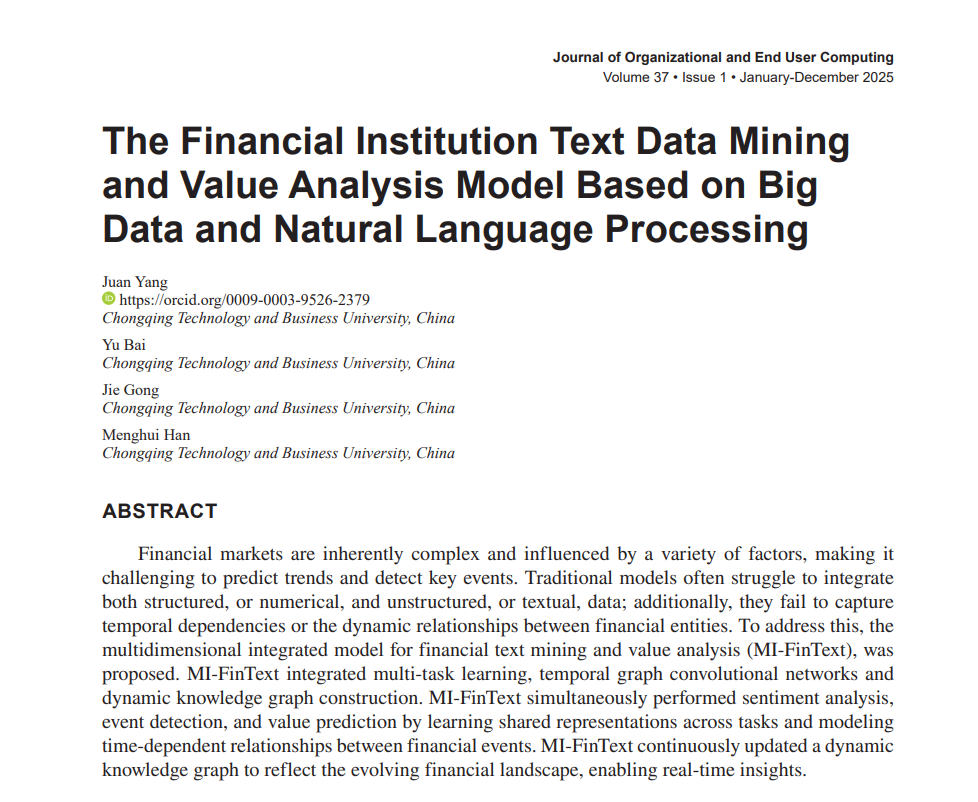 太阳成集团tyc122cc杨娟博士团队在管理学与信息科学交叉领域重要期刊《Journal of Organizational and End User Computing》上发表题为“The Financial Institution Text Data Mining and Value Analysis Model Based on Big Data and Natural Language Processing”研究成果。该期刊同时被SCIE和SSCI收录,在JCR分区中,其“信息科学与图书馆科学”学科排名位列前15%,“计算机科学·信息系统”学科排名位列前20%,是组织与终端用户计算领域内公认的高水平国际期刊。