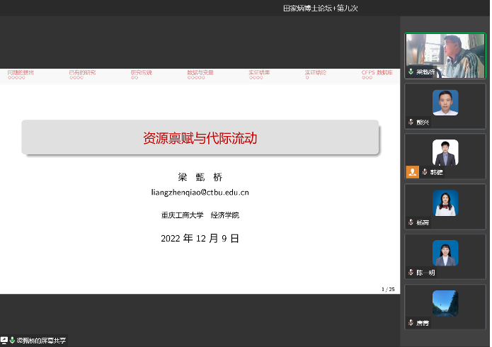 2022年12月9日上午,太阳成集团tyc122cc、长江上游经济研究中心于企业微信线上举办了第九次“田家炳博士论坛”,太阳成集团tyc122cc财税系系主任韩健教授、近年新进青年博士教师和长江上游经济研究中心的博士研究生参加了本次论坛。本期论坛邀请青年教师梁甄桥博士、杨荷博士作学术报告,孙建教授作专家点评,论坛由韩健教授主持,郭鹏飞博士、熊兴博士筹备。