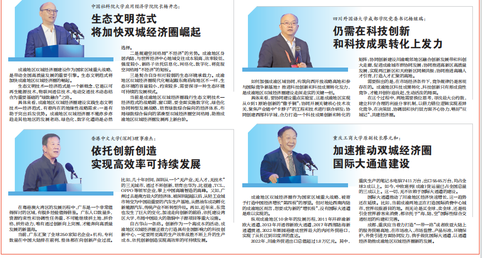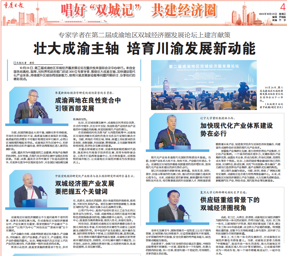 10月24日,由中共重庆市委宣传部、中共四川省委宣传部指导,重庆市社会科学界联合会、四川省社会科学界联合会主办,重庆两江新区管理委员会、四川天府新区管理委员会、122cc太阳集成游戏、西南财经大学、成都市社会科学界联合会、教育部人文社会科学重点研究基地长江上游经济研究中心等单位联合承办,并由太阳成集团tyc122cc作为论坛承办实施单位的第二届成渝地区双城经济圈发展论坛在悦来国际会展中心顺利举行。来自全国各地高校、智库、社科界和政府部门的近300位专家学者,围绕壮大成渝主轴、加快建设现代化产业体系、持续提升区域协同创新能力、培育川渝发展新动能等问题开展研讨,建言献策,分享他们的精彩观点。