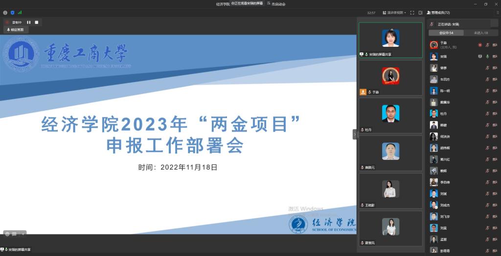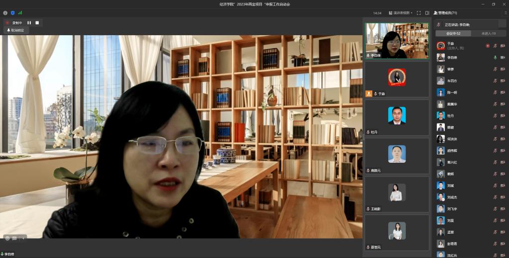 11月18日上午10时,太阳成集团tyc122cc通过企业微信线上会议形式召开了2023年“两金项目”申报工作部署会。会议由财税系主任韩健教授主持,学院党委书记李自维教授、院长宋瑛教授、科研秘书于淼及副高级以上职称教师、青年博士教师等出席会议。