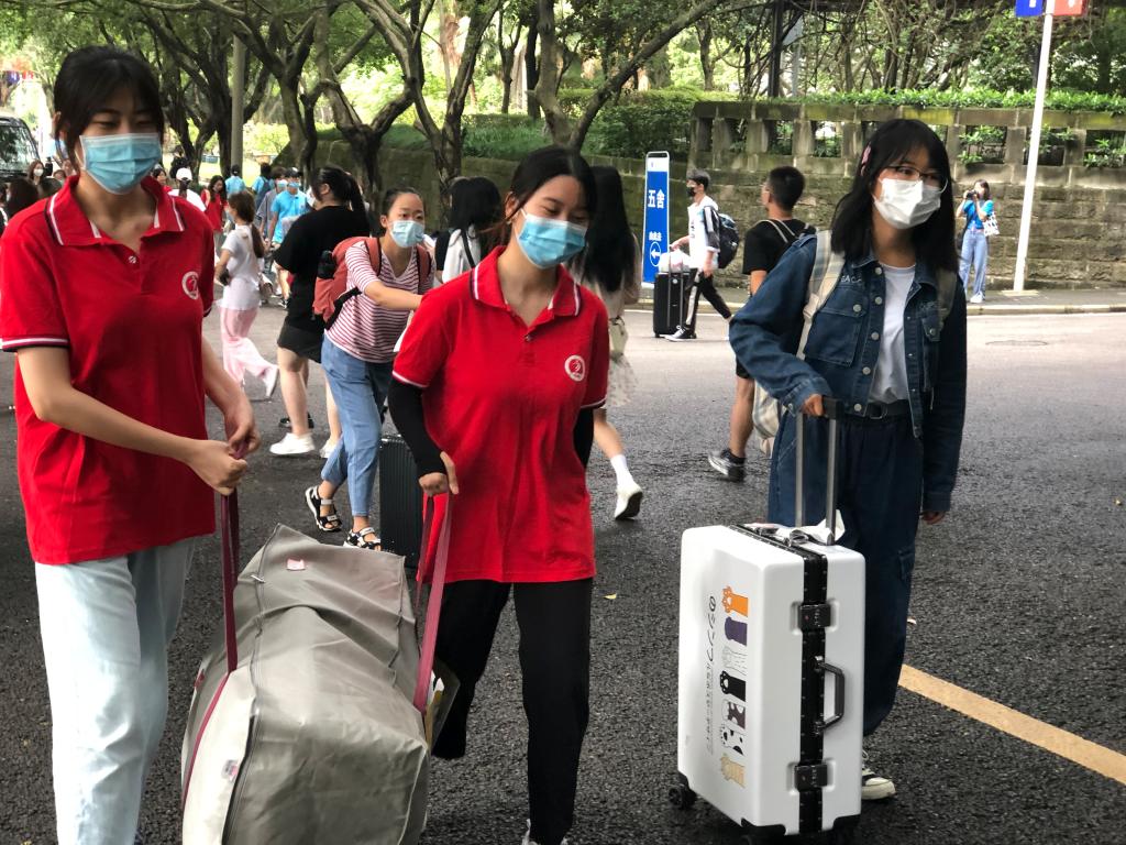 太阳成集团tyc122cc参加本次迎新的志愿者为40人,分别来自大二、大三年级。早上六点,着红色院服的太阳成集团tyc122cc志愿者们陆续从南岸校区出发前往江北校区新生接待处,大家完成签到、明确工作任务后,分头前往各自工作岗位投入了紧张繁忙地迎新接待准备工作。早上七点便陆续有提着行李的新生前来报到,一张张崭新的面孔为清晨的校园注入了新鲜活力。在校门口,志愿者们主动从家长手中接过新生的行李,带领新生有条不紊地去篮球场对应帐篷处领取报到单、去核算采样点做核酸、办理寝室入住手续等相关入学工作。放眼望去,校门口、核酸检测处、宿舍楼、校园道路上,到处都是志愿者们留下的红色身影,他们精神饱满,积极耐心,不辞辛苦,怀有满腔热情,热心为同学们服务。另外,为了让新生们尽快熟悉新环境,融入大学生活,作为学长、学姐的他们也细心地向新生们介绍学校各楼层分布,为新生指路,告知生活注意事项,为学弟、学妹们将来的生活提出了切身实际的建议,一路谈笑风生。炎炎烈日,难敌新一届求学渴望;默默奉献,方显志愿者无私真诚。
