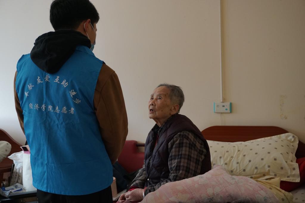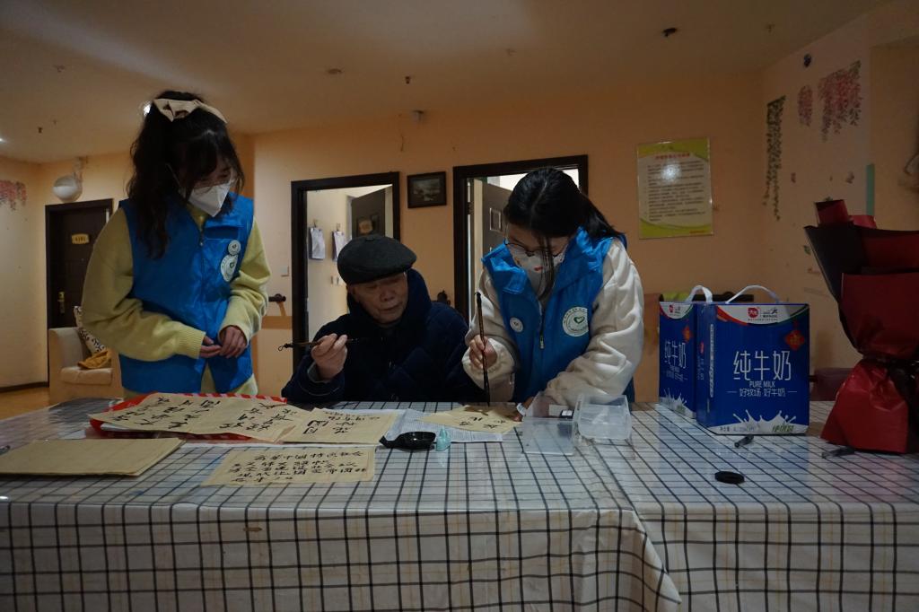 伴着和煦的春风,志愿者们走进聚福岛养老院,将提前准备的鲜花、糕点、水果发放给老人,活动也在此时拉开帷幕。志愿者们纷纷走进房间,帮老人们整理生活用品、按摩手脚,喂他们吃糕点,与他们一起散步、共沐春日等。志愿者与老人们促膝交谈,在了解到老人的一些经历更是大为触动,如年少赴美参与药品研制并携之归国的老人、为国家制糖工业做出贡献的爷爷等,如若不是他们为新中国建设无私奉献,何来如今的盛世繁华。最后,志愿者们邀请各位老人在大厅合影,定格温馨时刻,耄耋之年却仍旧热爱书法的冯爷爷也为志愿者的到来热情题字,祝福青年志愿者成为国之栋梁,为社会主义建设鞠躬尽瘁。每一位老人以身为例对青年志愿者诉说着时代的奋斗底色,紧握的手酝酿着无声的精神传承,他们的脸上洋溢着对后辈希冀的神情,心里满是对青年人的赞许。