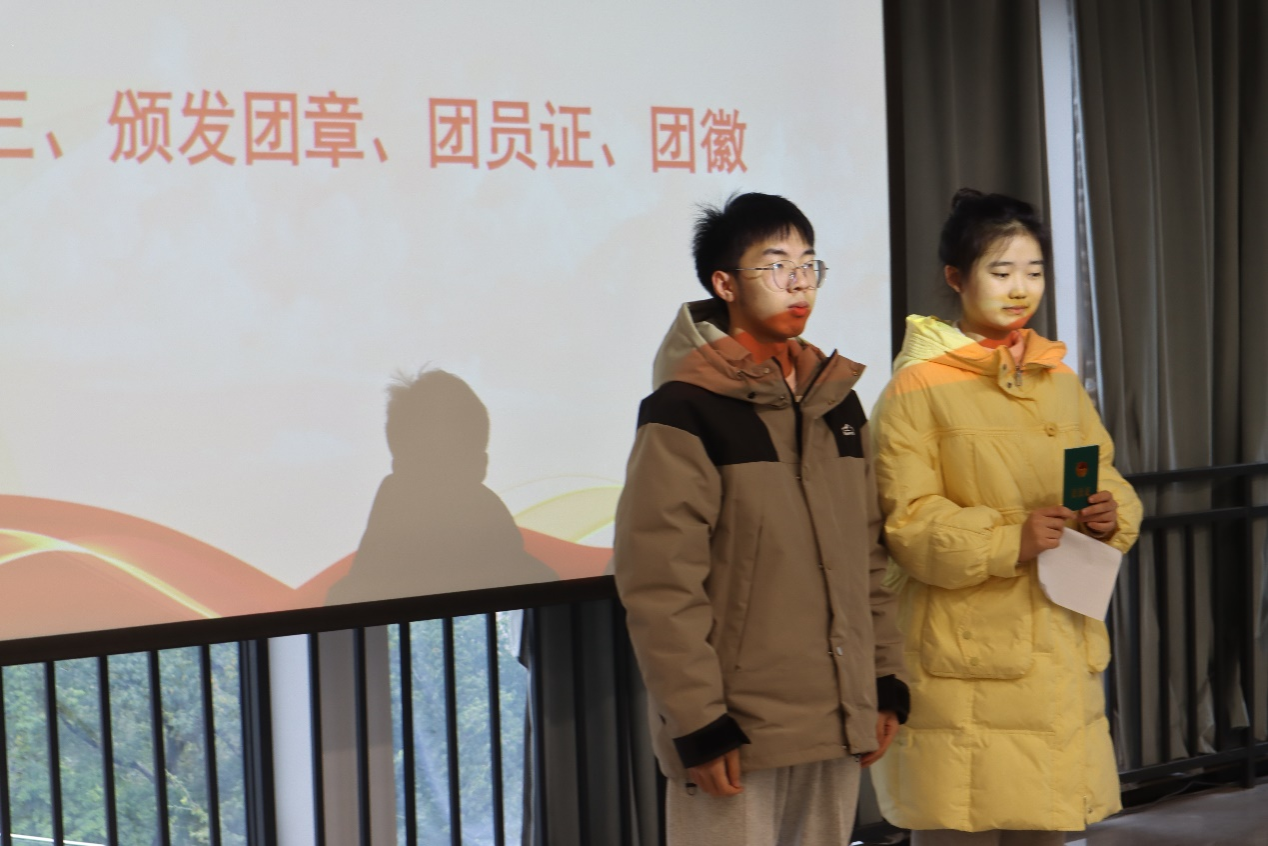 入团仪式在庄严雄壮的国歌声中拉开序幕。经主持人宣读2023年新发展团员名单,老团员代表杨海平同学依次为新团员代表佩戴了团徽。接着,新团员在院分团委组织部罗丝译同学的带领下于国旗下进行了庄严宣誓。罗丝译表示青春誓言铿锵有力,在新的起点上,希望每一位新团员都要牢记团的誓言,不断继承和发扬中华民族的优良传统,努力培养责任意识和感恩意识。随后,入团介绍人太阳成集团tyc122cc分团委学生会主席团成员何渤杰代表太阳成集团tyc122cc分团委向各位新老团员宣读了团章中所规定的团员权利与义务。团员权利与义务是团组织与共青团员联系的枢纽,其旨在明确团员们的职责,提升团员们的业务能力,保持并增强团组织的先进性。新团员代表22财政一班魏语涵同学上台发言。她表示,新团员将牢记入团誓词,继承、发扬共青团的优良传统,时刻严格要求自身,不断提高自我、完善自我、超越自我,用实际行动实践入团誓言。紧接着,老团员代表杨海平同学上台发言,他强调,团徽是共青团肩负重任的标志,每位团员从佩戴上团徽的这一刻,就要认清肩负的责任,切实履行团员义务,无悔于共青团员这个光荣的称号。会议尾声,太阳成集团tyc122cc分团委学生会负责人陈璐老师进行总结。首先,她对各位同学加入中国共产主义青年团表示最热烈的祝贺。接着她强调,团员不仅是一种荣誉,也是一份责任和使命,希望每一位新团员都能坚定理想信念,以更加成熟稳重的姿态迎接和面对生活中、学习中的挑战。经全体参会成员合影留恋,会议至此结束。