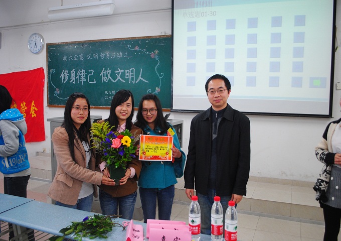 活动开始,主持人首先介绍到场嘉宾,然后宣布活动正式开始。本次活动主要内容分为“文明修身作品展示”、“文明修身问题竞答”、“插花比赛”三个主要部分。首先北六栋的六层层长王敬慈通过对PPT的讲解对“文明修身”这一主题进行了阐述,同时介绍了我们本次活动的意义。然后,冯湛老师和郝颖老师对入选的14份作品进行了评选打分,选出了前6名进入到第二轮的“文明修身问题竞答”比赛中去,然后再选出三名同学进入到最后的“插花比赛”。其间,在场同学们纷纷积极参加文明修身问题场外竞答活动,使活动氛围分外热烈,将活动推向高潮。