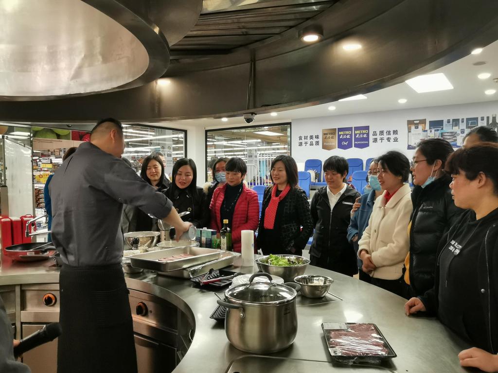 活动邀请麦德龙餐饮学院戴大厨为大家进行指导。戴大厨通过讲解、提问、抢答等方式深入浅出地说明了西餐的原料、配料和烹饪注意事项,并现场依次示范了西冷牛排、罗宋汤、奶油意面的做法。随后,老师们在大厨指导和相互辅助下亲手烹饪了牛排和奶油意面,现场香气四溢、欢声笑语,厨艺得以提升,味蕾得以满足,团结得以彰显,有趣的学习方式得到了老师们的一致认可。