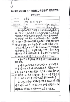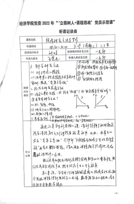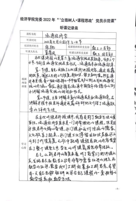 在示范课中,授课教师紧扣专业课程教学内容,深入挖掘其中所蕴含的“思政元素”,将爱国情怀、品德修养、科学精神、思维方法等巧妙融入到专业授课内容中,体现了“课程思政”、“课程育人”的理念和要求。教工一支部党员刘晗老师的《经济研究方法与写作》课程采用引导式教学法,激发学生主动思考,并结合热点问题融入思政元素;教工一支部党员刘斌老师的《微观经济学》课程设计了新颖有趣的导入案例,通过生动的案例与图解,充分调动学生参与课堂的积极性;教工二支部党员张驰老师的《流通经济学》课程以生动有趣的案例导入,并结合工匠精神巧妙融入思政要素,深入浅出讲授了流通实现及其效率;教工二支部党员孙畅老师的《城市商业区开发实务》课程结合丰富案例打造了生动有活力的课堂,以真实问题情景引导学生将知识融会贯通、学以致用;教工二支部党员黄玲老师的《现代服务贸易概论》课堂充分运用“学习通”平台与学生互动,充分调动学生课堂参与积极性,课堂讲授生动活泼,富有吸引力;教工二支部党员王疏影老师的《研究与咨询方法》引导学生通过总结汇报和交流讨论的方式,掌握学术论文写作的方法,充分调动学生主观能动性,激发学生思考;教工四支部党员张充老师的《公债学》课程通过对美国、欧盟与我国关于国债管理的案例进行对比,阐述我国国债管理制度的优势,潜移默化地将思政教育贯穿课堂;教工四支部党员汤凤林老师的《国际税收》课程中将国内外的国际税收案例进行对比,突出我国政策的优越性,增强学生的国家认同感,坚定学生对中国特色社会主义道路的信心;教工五支部党员林黎老师的《政治经济学》课程结合具体案例讲授“按劳分配为主体、多种分配方式并存”的基本分配制度,实现课堂教学与思政元素的融合;教工五支部党员吴正俊老师的《政治经济学》课程讲授了社会主义市场经济体制改革的历程,结合历史事件阐释社会主义市场经济体制不断完善发展的根本原因在于始终坚持和加强党的领导,从而将思政教育贯穿课堂教学。