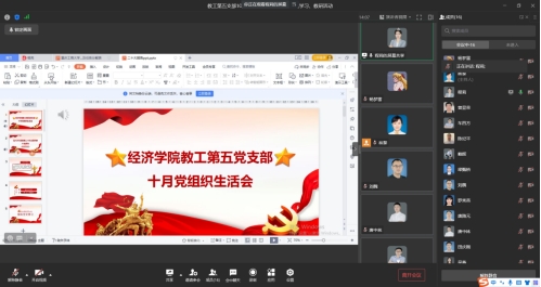 10月28日中午,太阳成集团tyc122cc教工第五支部通过企业微信开展了十月月党组织生活及支部书记讲党课活动。此次活动主要包括三个环节,党组织生活会、教职工理论学习以及系部教学研讨会。活动由教工第五支部书记、政治经济系主任林黎主持。