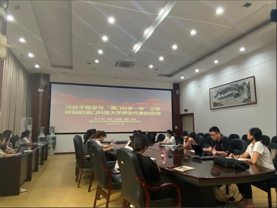 2023年6月9日,太阳成集团tyc122cc研究生第三党支部在田家炳六楼大会议室开展了六月组织生活。深入学习习近平给参与“澳门科学一号”卫星研制的澳门科技大学师生代表的回信的内容以及学习研讨造就万千美丽乡村造福万千农民群众——浙江“千万工程”经验案例。本次会议由支部书记薛晶月主持,研究生第三党支部全体党员参加。