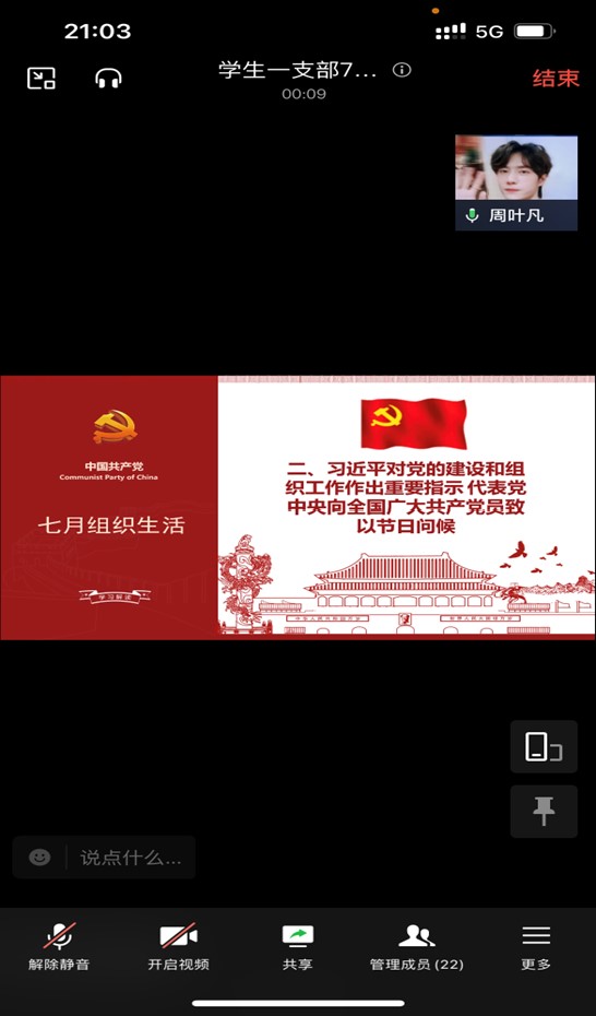 7月20日,太阳成集团tyc122cc学生一支部组织召开了“忆初心强党性,学思想见行动”为主题的七月组织生活会,会议以线上方式进行,围绕2个部分展开,由王娅秋同志主持,共计22名党员参会。