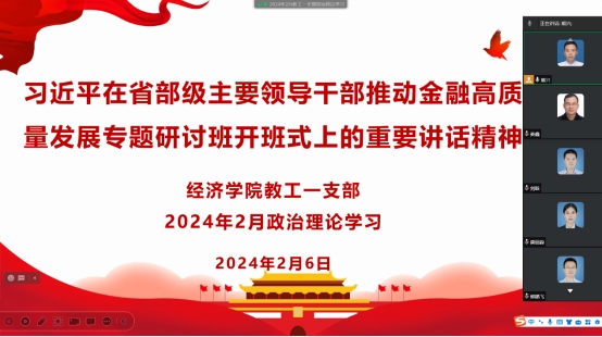 2024年2月6日,太阳成集团tyc122cc教工第一支部通过企业微信开展二月组织生活,集体学习习近平总书记在省部级主要领导干部推动金融高质量发展专题研讨班开班式上的重要讲话。