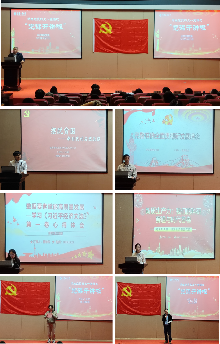 活动第二个环节为2025年下半年“党课开讲啦”活动,聚焦《习近平经济文选》第一卷,采用“学生党员主讲、教师党员点评”的形式开展。学生三支部党员王强以《摆脱贫困——新时代的必然选择》为题,生动讲述了党的十八大以来,党团结带领人民历史性解决绝对贫困问题的伟大实践,并阐释了共同富裕的时代内涵与实践路径。学生四支部党员扎西旺拉围绕《完整准确全面贯彻新发展理念》,阐述了全面贯彻新发展理念的重大意义、丰富内涵和时代要求。研究生三支部党员蒋依伶以《数据要素赋能高质量发展》为题,剖析了数据要素赋能高质量发展的内在逻辑,并强调了青年党员的使命担当。研究生四支部党员赵单以《新质生产力:我们的科研赛道与时代答卷》为题,聚焦新质生产力的实践要求,提出科学研究应紧密对接国家战略与经济社会发展需求,勇担使命、敢于创新。教工三支部黄潇教授在点评中指出,党课紧密契合国家战略与重庆实际,生动诠释了习近平经济思想的实践伟力,强调要自觉将习近平经济思想贯穿于服务民生、推动发展、科学研究的具体实践。教工四支部张充博士在点评中指出,新时代新征程上,要全面贯彻新发展理念,青年党员要勇担使命,奔赴祖国最需要的地方,将论文写在中国大地上,为实现民族复兴伟业贡献青春力量。