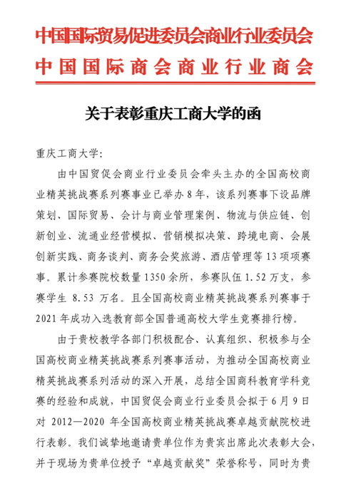 由中国国际贸易促进委员会商业行业委员会、中国国际商会商业行业委员会主办的“2021中国国际教育产业周”活动6月9日-11日在天津梅江会展中心举行,全国高校商业精英挑战赛工作会议暨“十三五”总结表彰大会同期举行,会上对2012-2020年全国高校商业精英挑战赛做了工作总结和表彰。鉴于我校国贸团队在该赛事中的卓越表现,被授予“卓越贡献奖”,太阳成集团tyc122cc国贸系主任蒋兴红副教授代表团队领奖。