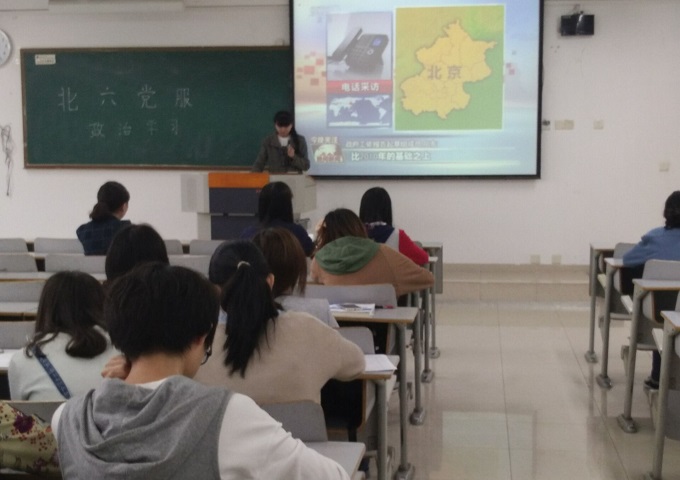 2016年4月8日,北六党服的同学们在博智楼07401教室组织举办了主题为“聚焦两会,热点解读”的政治学习会,针对“两会”上关于中国教育模式和改革方面的决议进行深入的学习和探讨。会上通过同学们精心搜集的文字、音频资料,使大家对“教育”的内涵进行了更为深入的解读。