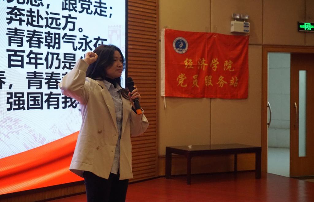 听完李治贤老师精彩的讲述后,主持人邀请了两位同学分享其感悟与收获。其中,20级国贸三班的周叶凡表示青年学子应将个人价值与社会价值相结合,努力学习先进党员的优秀品质,为社会的进步与发展贡献自己的一份力量;20级国贸三班的李新荣感触颇深,她结合李老师的讲解,通过实例分析的方式论证了党和人民的无限智慧与伟大创造力,同时鼓励在场站员能够以史为鉴,不断汲取我党在百年奋斗历程中积累的经验与智慧。最后,太阳成集团tyc122cc研究生代表汪林静带领全体参会人员进行宣誓。站员们高举右手、目光坚毅,共同许下了立志成才、报效祖国的誓言,在庄严肃穆的党旗面前更加坚定了为党的事业奋斗终生的决心和勇气。
