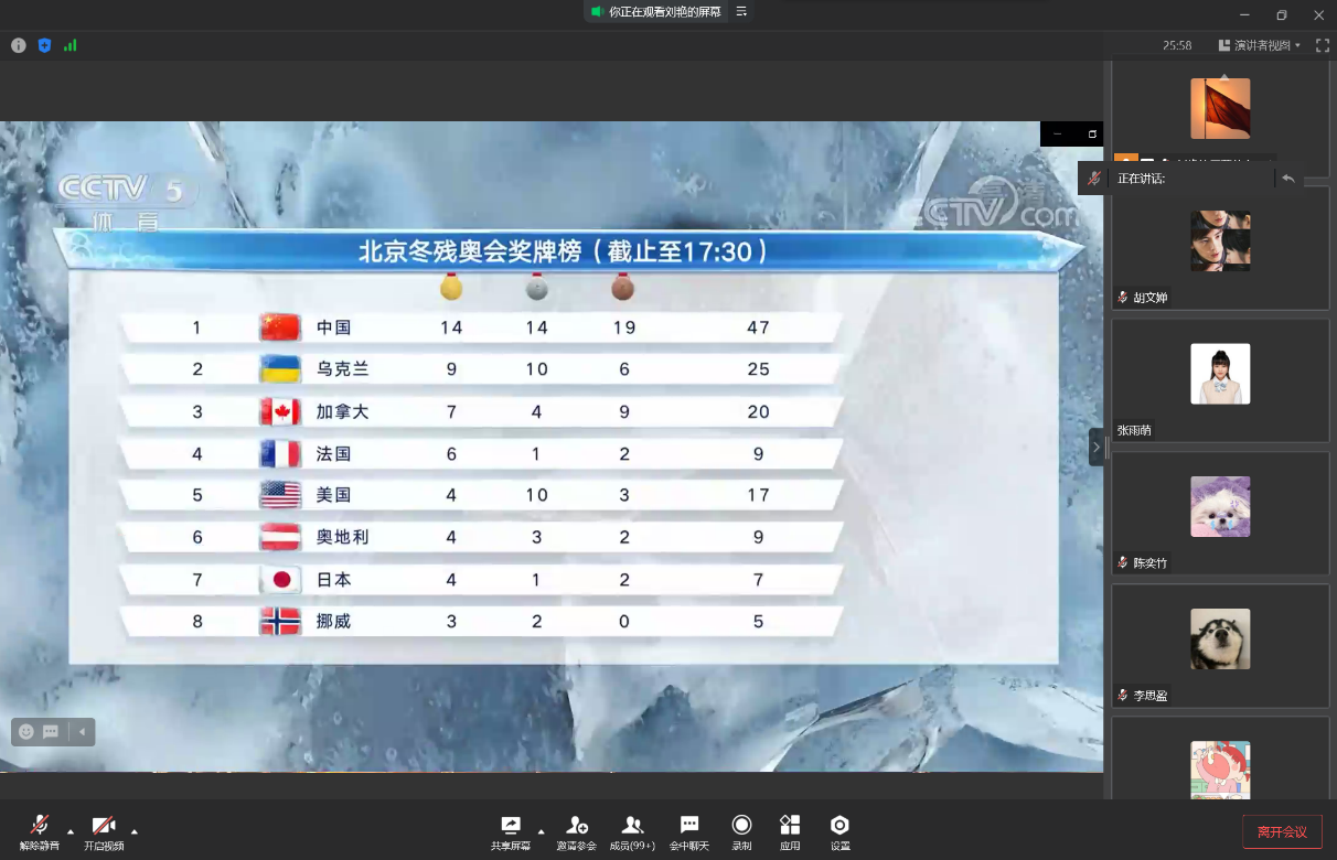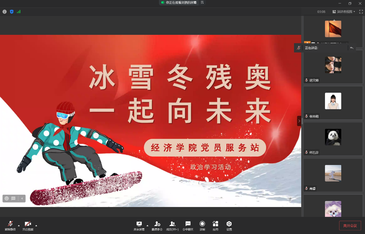 2022年3月13日,北京冬残奥会闭幕式在北京国家体育场“鸟巢”如期举行,历时九天的“冰雪之约”就此划上了圆满的句号。为了弘扬“勇气、毅力、激励、平等”的残奥价值观,使同学们进一步感受到来自残奥运动员身上所具备的拼搏精神和顽强意志,3月18日太阳成集团tyc122cc党员服务站通过线上直播的形式举办了“冰雪冬残奥,一起向未来”政治学习活动。本次活动涵盖面广,共有18至21四个年级250位站员参加。活动由20级贸经一班的姚奕主持。