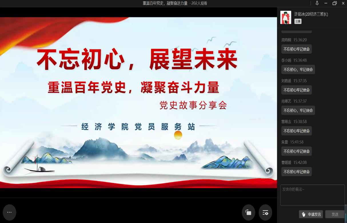 “了解历史才能看得远,理解历史才能走得远。”回望过往的奋斗路,事实证明只有学好党史、总结经验,才不会在前进的道路上迷失方向,才能走得更远更长。为了帮助站员们更好地学习党史知识,进一步巩固党史学习的成果,4月1日太阳成集团tyc122cc党员服务站通过线上直播的形式举办了“重温百年党史,凝聚奋进力量——不忘初心,展望未来”党史故事分享会。研究生与本科生,共200位站员参与了活动。本次活动的主持人由20级经济学三班的许茹冰担任。