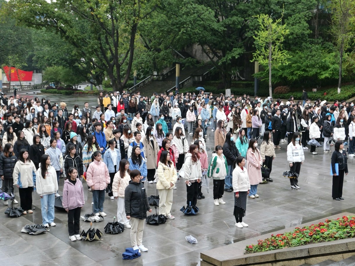(冒雨参加升旗仪式的师生,楼科易摄)