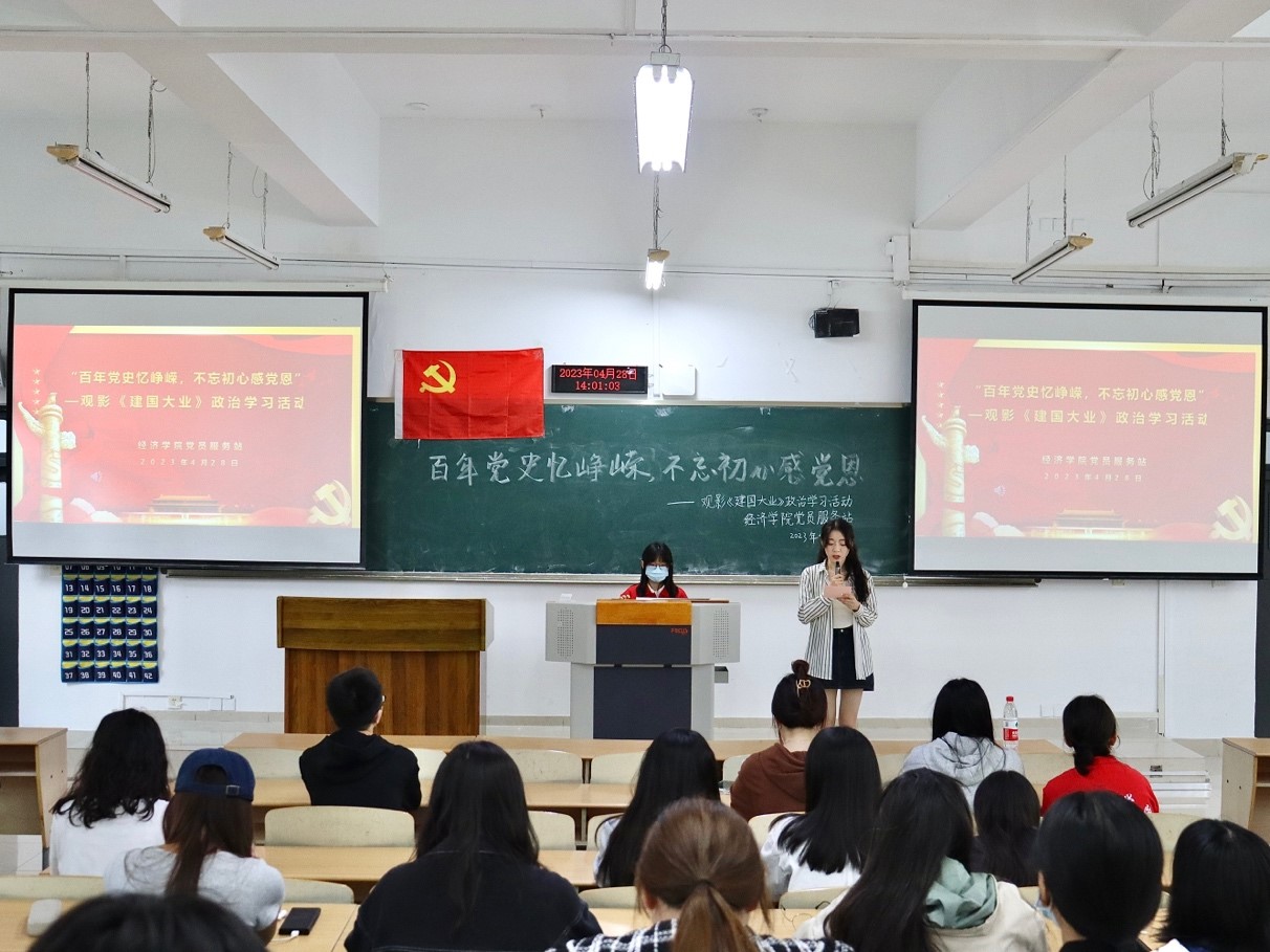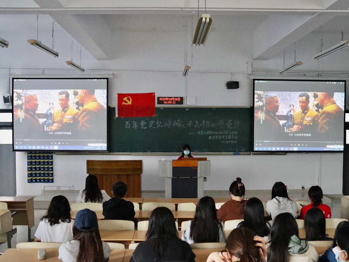 “学史明理,学史增信,学史崇德,学史力行。”为深入贯彻习近平总书记在党史学习教育动员大会上的重要指示,不断巩固拓展党史学习教育成果,进一步加强站员们对红色革命精神的理解,太阳成集团tyc122cc党员服务站于2023年4月28日在博智楼07207举办了“百年党史忆峥嵘,不忘初心感党恩”——观影《建国大业》政治学习活动。本次活动由21级国贸一班何海蓉同学主持,共70余名站员参与其中。
