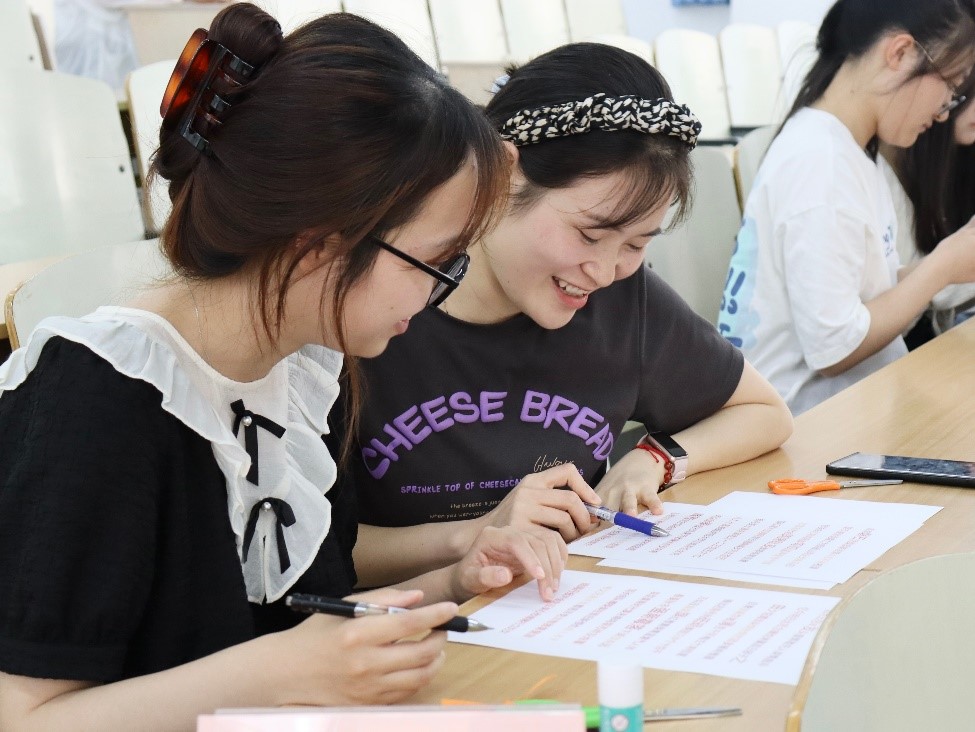 下午16时,活动正式开始。主持人首先介绍了本次活动的背景与规则,并将站员分为八组。每组站员需将所给素材中部分字词或短句剪下进行再创作,共同完成一首拼贴诗。工作人员将材料及工具分发完毕后,主持人宣布进入拼贴诗创作环节。伴随着优美的乐曲,各组成员全神贯注查找可用素材,积极讨论、揣摩拼贴诗的内容。创作完成后,各小组依次展示成果,并由小组代表上台分享感悟。“忆往昔峥嵘岁月,喜百年风华正茂,望明日征程浩荡”,殷忧启圣,多难兴邦,第二组以时间为脉络展现了中华民族的巨大飞跃;“生死征程血渡江河,怜枯发迟暮;老骥伏枥矢志不渝,望黎明破晓”,天地英雄气,千秋尚凛然,第六组将历史的奋斗化作书写未来的豪情壮志。各组分享完毕后,主持人宣布投票结果:第六组、第一组及第五组分别获得一二三等奖。至此,本次活动圆满结束。