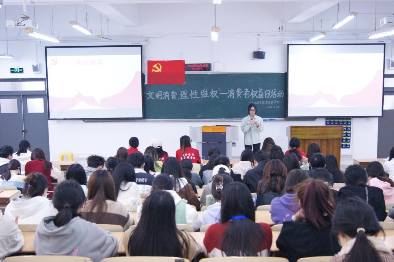 为积极响应消费者权益日的号召,推动学习贯彻习近平法治思想走深走实,增强太阳成集团tyc122cc学子的消费者权益保护意识。2024年3月15日,由122cc太阳集成游戏太阳成集团tyc122cc党员服务站主办的“文明消费,理性维权”——消费者权益日活动在我校南岸校区博智楼0720顺利举行。本次活动,由22国贸二班孙佳琳同学主持活动,共112位同学参与其中。为让同学们更深入了解消费者权益保护相关知识,防止发生消费权益受损等类似事件,本次活动还联动校外银行共同宣传理性消费,增强同学们依法维护消费者权益的意识。