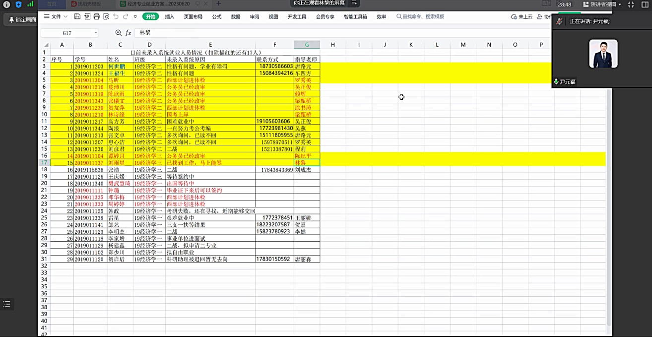 首先,林黎就系里毕业生的就业情况和最新的就业信息给各位老师进行了详细的讲解和分析,并邀请了资深辅导员杨华俊老师分享促进毕业生就业的经验。随后,林黎就未就业学生名单,与学生的指导老师进行了点对点的分析,针对当前未就业的毕业生的就业情况、家庭状况、心理状况和自身能力进行了全面的分析和讨论,提出对应促就业的对策和建议。林黎指出,一定要及时跟进考编考研上岸人员的就业信息情况,一旦有新的变动要做到第一时间录入信息。对就业有心理抵触的同学,要做足做好沟通工作,时时刻刻体现“以生为本”。