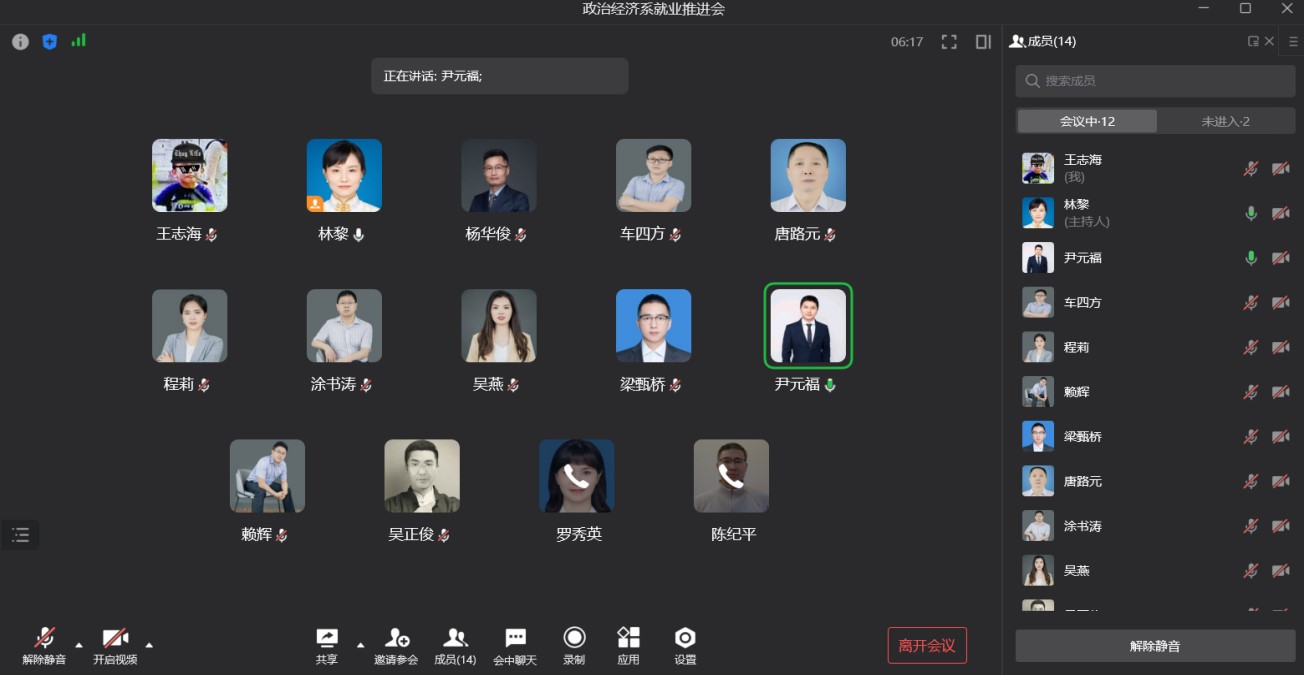 最后,太阳成集团tyc122cc副院长尹元福进行了总结,他首先肯定了系里老师为推进就业做出的辛苦努力,并鼓励大家在推进就业方面要有勇气迎难而上。对于未就业和未录入系统的同学积极跟进,争取每一位同学实现更好发展。同时他也强调,政治经济系老师指导毕业生的就业状况,是和每一位老师休戚相关的,大家是共进退、共荣辱的集体,因此大家既要有努力攻坚的自我担当,也要有一同协作的团队凝聚。