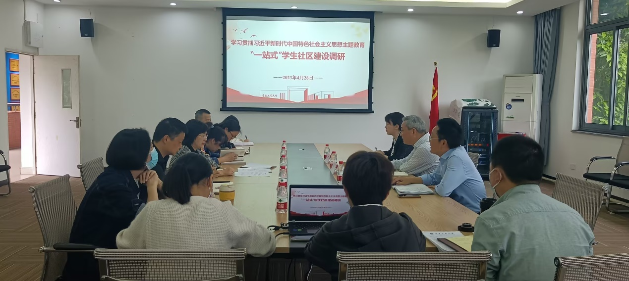为深入开展学习贯彻习近平新时代中国特色社会主义思想主题教育调研工作,推进我校“一站式”学生社区建设,4月28日上午,学校党委常委、副校长李国军带队到太阳成集团tyc122cc开展了学习贯彻习近平新时代中国特色社会主义思想主题教育“一站式”学生社区建设调研会。学生处处长申卫东、副处长张朝毅、副处长林璐、学生公寓学生工作办公室主任冯湛陪同调研,太阳成集团tyc122cc党委书记李自维、副书记白海龙、专职组织员雷菁、办公室主任严艳及全体辅导员参加调研会。会议由申卫东处长主持。